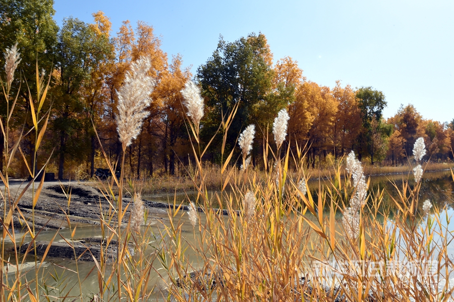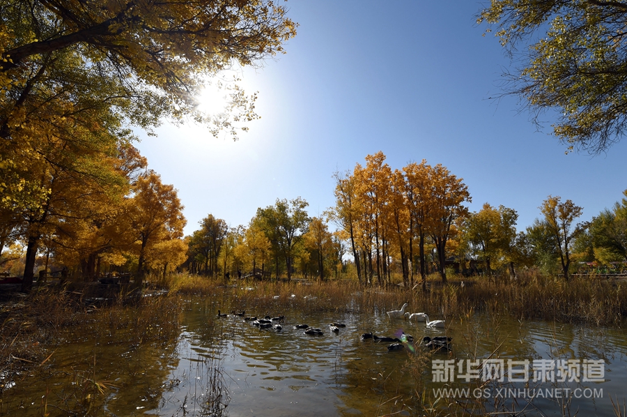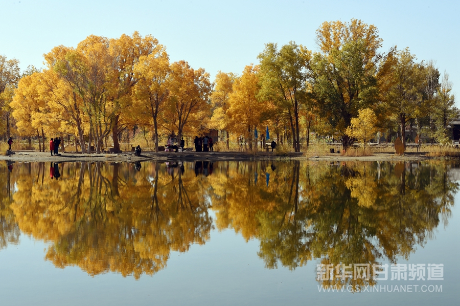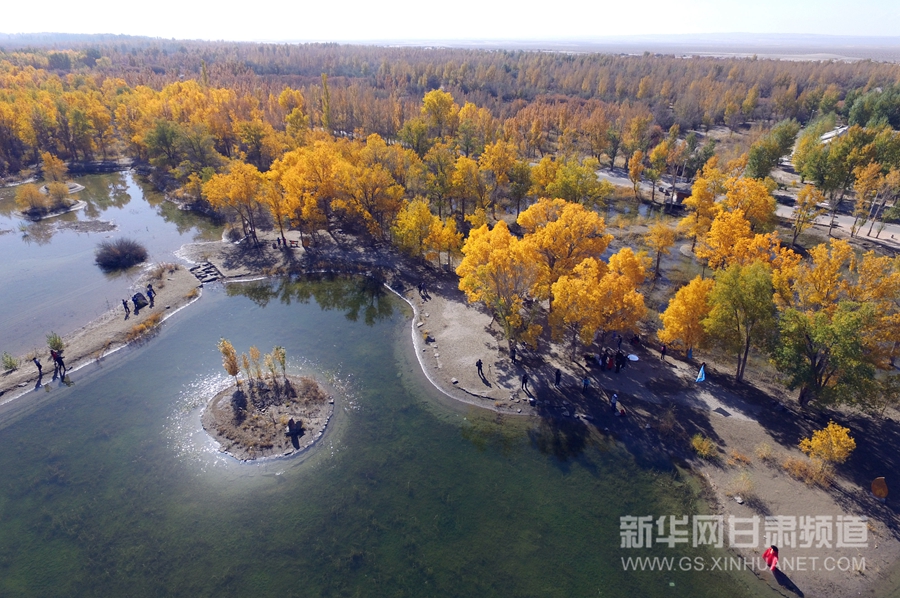 金秋十月,位于甘肃省酒泉市金塔县城以西的巴丹吉林沙漠边缘秋景如画。上世纪七十年代开始,巴丹吉林沙漠边缘实施“三北”防护林工程,种植了上万亩胡杨林,并开挖渠道引水修建人工湖。
