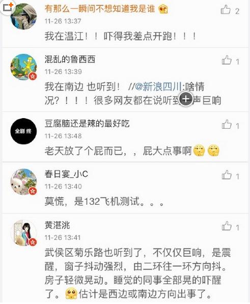 成都市区现巨响:“天空传来一声巨响,啥子情况?”昨日下午1时28分,四川著名评书表演艺术家李伯清在微博上发问。同一时间段里,多名成都市区及郫县、双流、温江网友也发微博称听到了巨响,大家纷纷猜测是否发生了爆炸。