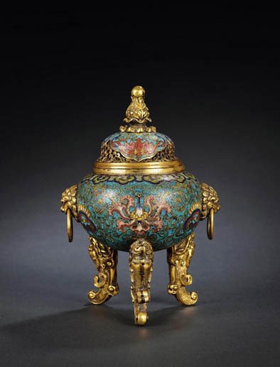 清中期 铜鎏金掐丝珐琅花卉兽耳三足熏炉