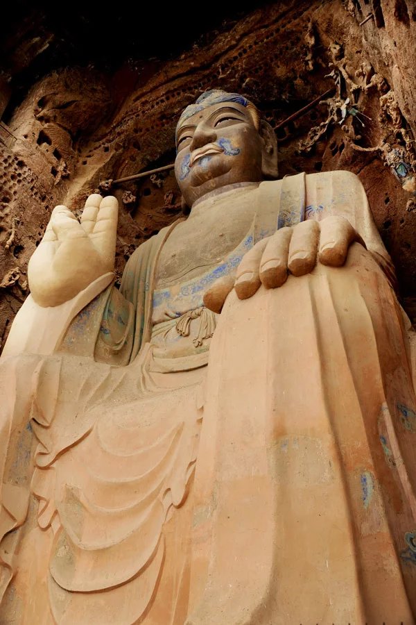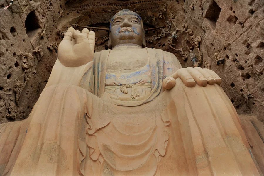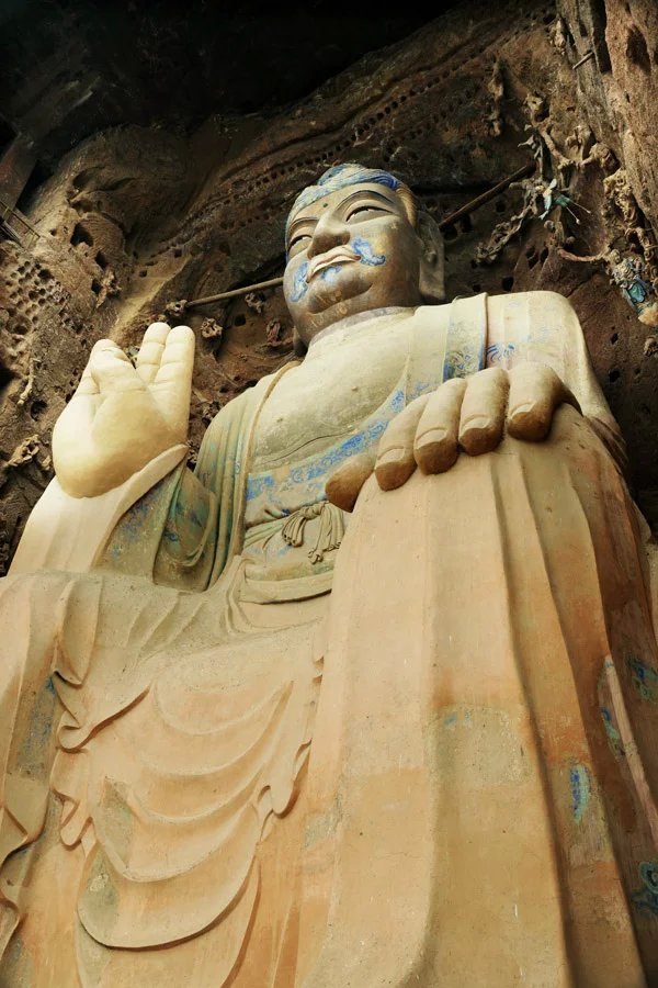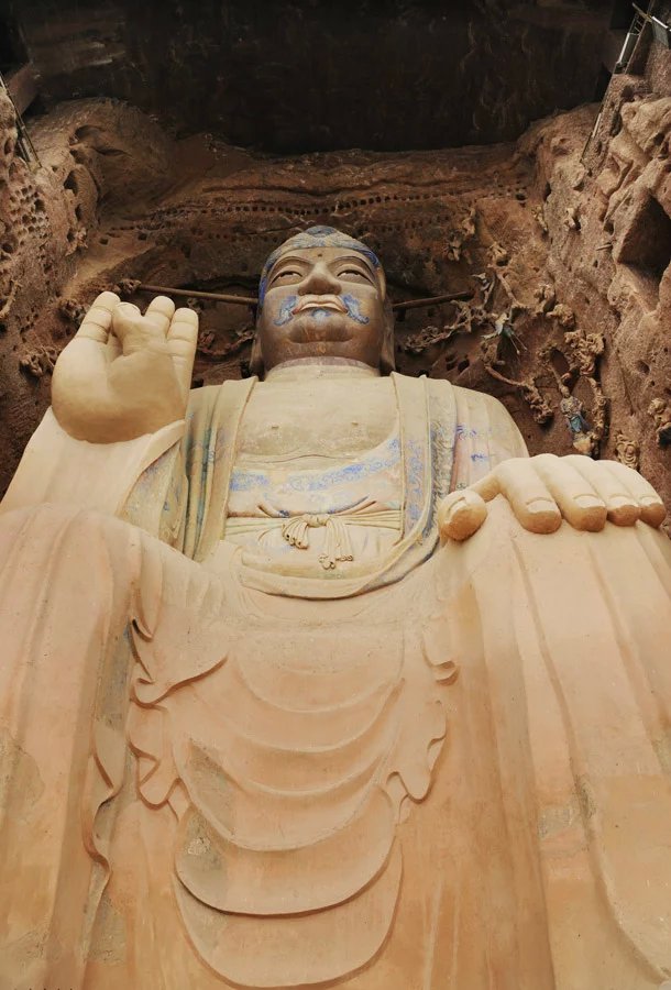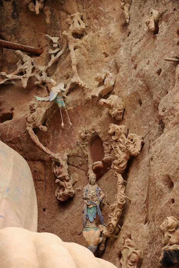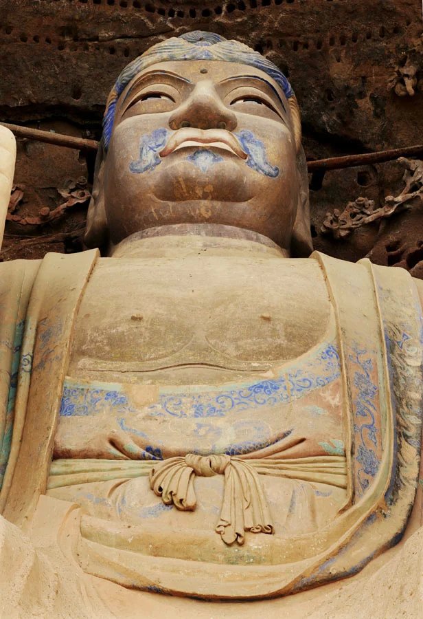 大佛为半圆雕石胎泥塑,高23.3米,肩宽9.5米,头高5.8米,膝长6米。其造型高大雄伟,令人仰止,所具有的文化特质可视为西方装饰性雕塑和中国写意性雕塑完美结合的艺术巨制。