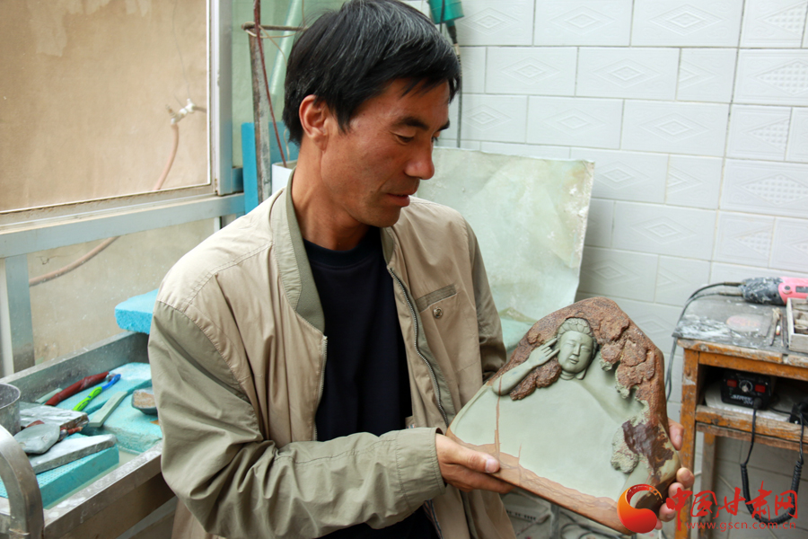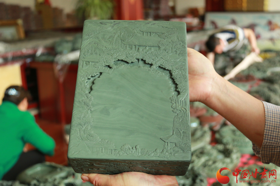 洮砚乡以产洮砚为名,全乡人几乎均从事以洮砚为生存的活计。洮砚乡的张克红师傅从事洮砚雕刻已有二十多年,以此为生。图为张克红展示自己的洮砚作品。本网记者 金琼 摄