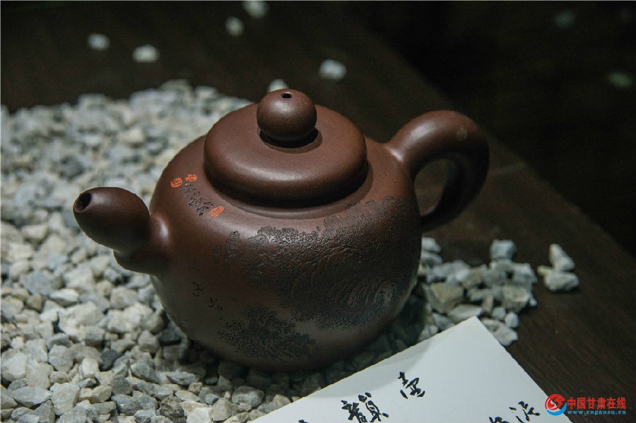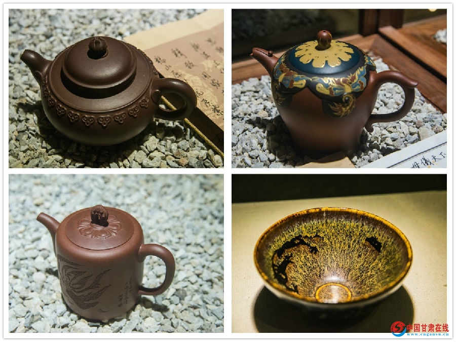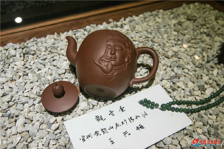 敦煌画院展出的宜兴紫砂壶。 (王斌银 摄)