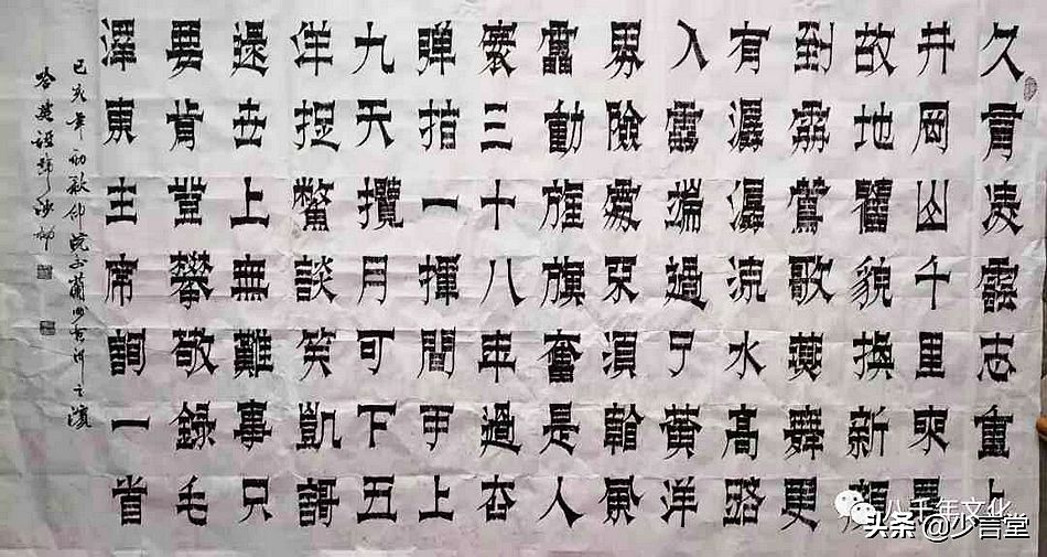 汉字书写,是一个人品操、学养、个性、气质的“心电图",所谓字如其人,运用到建设身上,再贴切不过了。他身上有许多好的品质,诸如好学、勤奋、公道、平和、实在、质朴、谦逊、不苟等,但最突出的是正直,正派做什么人,直道行事,这些品质透射在书法中,表现得淋漓尽致。秦篆的长形体态,到汉隶变为扁形,是一个时代书艺的巨大变化。哈建设以汉隶为基,采用魏碑金石韵味,形成方正字态;且方笔出入,中锋运行,有别于汉隶的蚕头燕尾,取金农笔意,这是他最为突出的两个特征。汉字俗称“方块字",但这“方块”却在历史漫长的衍变中因结体和笔势的变化,时长时扁,而方正形态的字体,因为容易呆板,又大见功力,少有人采用,建设博采众长,大胆用之,再配以方笔入出,正锋直遂,笔力遒劲厚朴,给人以堂堂正正,豪气干云,力发千钧之感,字里行间透出汉隶的俊逸,魏碑的峭拔,唐楷的严正,宋元意趣,非但消弥了人们对方正形态的审美定势,反而凸显了超凡脱俗,刚正不阿,抱朴守真的艺术魅力,这无疑是对当前书坛媚俗之风、诡异之气、市侩恶心的有力抵抗和反拔,独见其精神之所在。