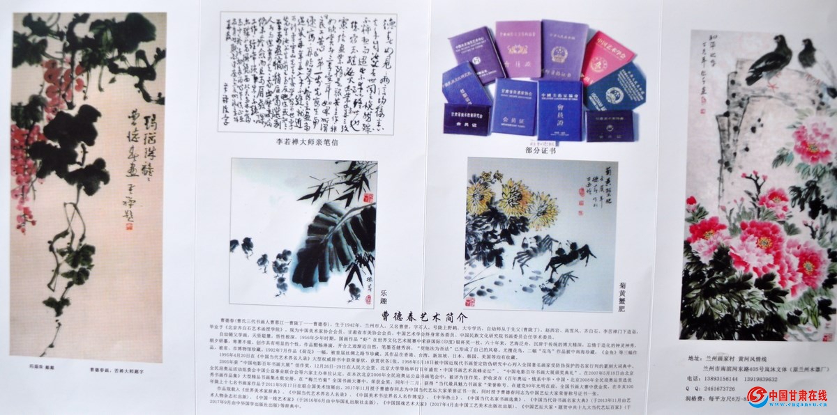 曹德春:号陇上野鹤,1942年生于兰州, 是我市少有的曹氏三代书画人之一。其祖父曹蓉江是我省清代著名大画家,父亲曹陇丁乃民国及当代甘肃大画家。他自幼师从于先父,后师从于赵西岩、高雪凤等,后深造于齐白石、李苦禅门下。1958年少年时期国画作品“虾”在世界文化艺术展赛中获国际银质奖。60多年来,他艺海泛舟,尤其擅长花鸟,被中南海收藏,其作品在香港、台湾、日本、美国等均有珍藏。现为甘肃省美术家协会会员和中国美术家协会会员,国家一级美术师,中国艺术协会终生常务委员,中国民族文化研究院书画委员会任学术委员。