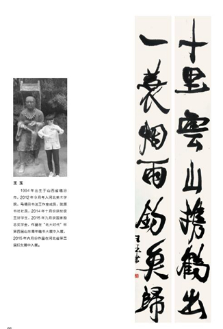 王玉1994年出生于山西省临汾市,2012年9月考入河北美术学院,马德田书法工作室成员,陇原书社社员,2014年十月份获校级三好学生,2015年九月获国家励志奖学金,作品在“北大时代”杯第四届山东青年临书大展中入展,2015年六月份作品在河北省第二届妇女展中入展。