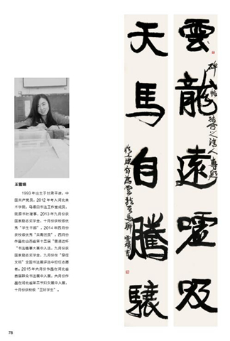 王雪娟 1993年出生于甘肃平凉,中国共产党员,2012年考入河北美术学院,马德田书法工作室成员,陇原书社理事,2013年九月份获国家励志奖学金,十月份获校级优秀“学生干部”,2014年四月份获校级优秀“共青团员”,四月份作品在山西省第十二届“晋通达杯“书法临摹大赛中入选,九月份获国家励志奖学金,九月份在“祭侄文稿”全国书法展评选中担任志愿者。2015年六月份作品在河北省首届群众书法展中入展,六月份作品在河北省第二节妇女展中入展,十月份获校级“三好学生”。