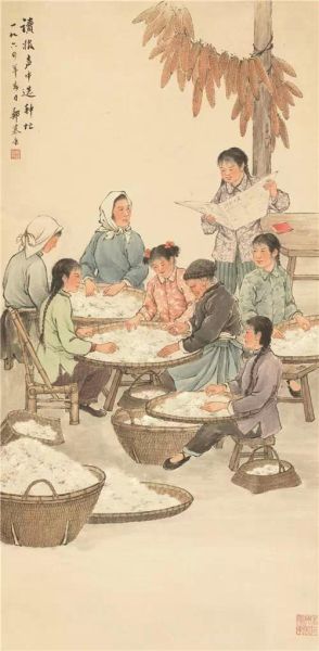 《读报声中选种忙》是郑慕康在新中国社会主义现实主义美术思潮中的精心之作,作品描绘了农民在读报声中选种子的情景,右上角的少女正在读的是《解放日报》——正是在1964年的一月份,毛泽东主席在同吴冷西同志关于报纸工作的谈话中专门表扬了解放日报:“解放日报比较注意抓思想,抓思想工作,值得看一看。”《解放日报》也因之在同一年进入郑慕康的作品之中。郑慕康在画面中对人物的表现方式吸取了西方绘画中的透视技巧和明暗手法,但其用线又具有中国传统绘画的特征。该件作品歌颂并表现了劳动人民,主题性突出,体现出毛泽东时代中国人物画的典型特征。