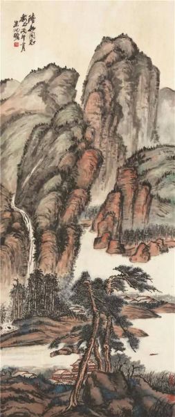 本幅山水画为海派著名画家朱梅邨所作,朱梅邨13岁开始就从舅父吴湖帆习画,19岁即卖画为生。曾与叶恭绰、吴湖帆、张大千、冯超然等一起组织正社画会。他是吴湖帆学生之中的佼佼者,也为吴湖帆所赏识。上世纪三十年代故宫博物院举办赴伦敦画展,朱梅邨经吴湖帆推荐为保管员,得以观摩名画真迹,开拓眼界,其作品气格骨韵自是不凡。朱梅邨在用色方面颇得吴湖帆真传,所画青绿、浅绛均有一种文人的雅致与雍容。