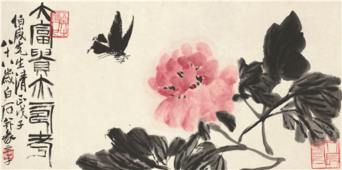 齐白石定居北京后,每逢花季都要去公园看牡丹,对牡丹的形态烂熟于心。早年受吴昌硕影响,牡丹多清瘦,重视枝干的穿插,叶片较少,追求花瓣的结构层次。九十岁以后,往往用极重的洋红,更加美艳夺目,但仍在意形似,九十五岁后,画牡丹更多,却几乎脱略了具体的形象,返璞归真。是幅《大富贵亦寿考》白石老人以没骨大写意法直接用胭脂红泼写出盛放的牡丹,红花墨叶,笔墨和形象融为一体,淋漓尽致,显示出极佳的创作状态。传达出老人对友人的美好祝愿,同时也寄托了老人至为朴素的平民情感。