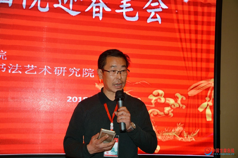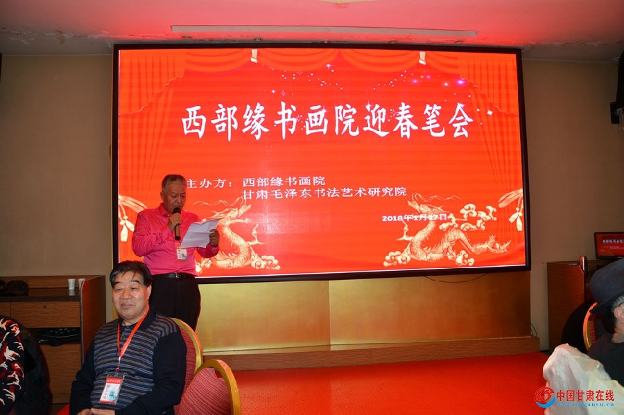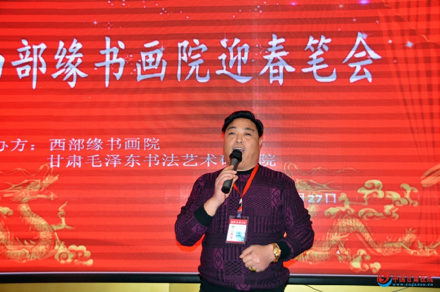 辛万毅介绍说,西部缘书画院是在原 “辛万毅正能量书画交流群”基础上建立起来的,办院的性质是非盈利性的,自愿报名参加,AA制形式的公益性群众团体。曾经应广大群成员要求,于2017年10月28日在西固区举办了“不忘初心,翰墨筑梦,欢度重阳节”书画交流笔会,与会人员有近50人,活动取得圆满成功。为此,广大书友有一个共同的声音,通过这样的活动,能使大家交流学习,增进友谊,共同提高。在书友达成共识的基础上,2018年1月2号,书画院又和毛泽东书法艺术研究院,甘肃头条,兰州手足外科医院共同举办了迎新年书画联谊会,效果良好,赢得了大家的赞誉。在2018年春节到来之際,大家强烈要求举办一次迎春笔会活动,经过一个星期的努力和准备,在毛泽东书法艺术研究院领导的指导下和协办单位的大力支持下,今天在这里举办第三次西部缘书画院迎春笔会活动,各界来宾90多人与会。