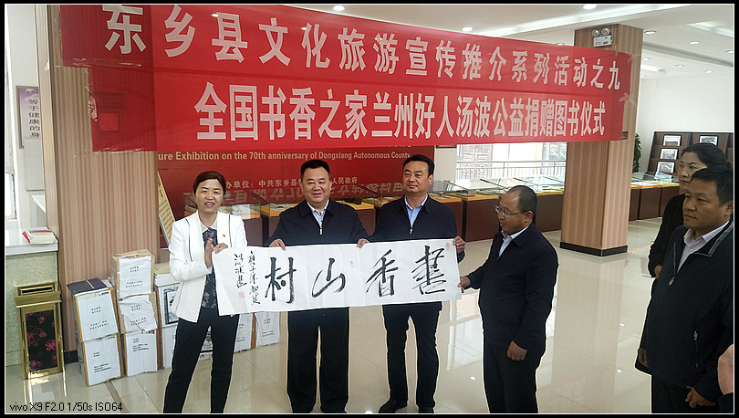 扶贫扶智,公益不停歇,汤波及其志愿团队再次来到西固区达川镇吊场村,为村民送去数百本三农科技方面的书籍,捐赠图书包括《信访理论与实践》、《现代农村文明礼仪读本》、《三农问答》、《农村创业致富攻略》以及养殖等方面的书籍并现场为村民书写了二十余幅书法作品,受到了村民们的赞许和好评。当天吊场村村民向汤波及其志愿者团队赠送"书香传爱心,扶贫先扶智"锦旗。