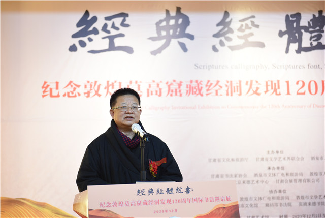 金城瑞雪飞琼瑶,翰墨飘香书莫高。12月2日,金城兰州瑞雪飘飞,甘肃艺术馆内墨香四溢。为认真学习宣传党的十九届五中全会精神,深入贯彻落实习近平总书记在敦煌研究院座谈时的重要讲话精神,大力弘扬敦煌文化,加强对国粹艺术的传承与保护,展示中华民族文化自信,由省文化和旅游厅、省文学艺术界联合会、酒泉市人民政府共同主办,省书法家协会、北京来德艺术中心、敦煌市人民政府联合承办,敦煌研究院协办的“纪念敦煌莫高窟藏经洞发现120周年国际书法邀请展”在甘肃艺术馆开幕。