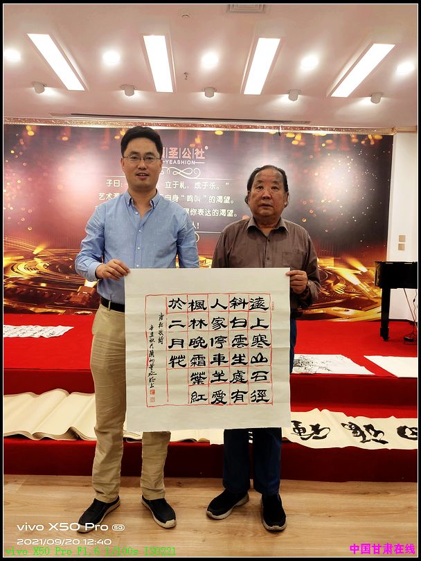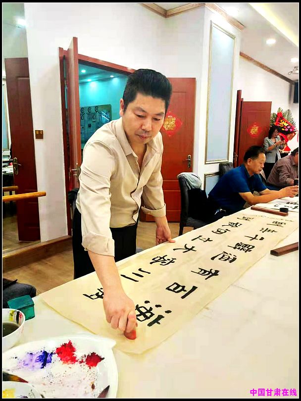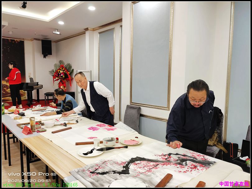 中国甘肃在线兰州讯 2021年9月20日上午九时,甘肃西部缘书画院一行十位书画家应颐圣公社文化艺术中心邀请,在兰州市西关什字大唐宫举办了迎中秋书画笔会活动,并进行了签约仪式。现场翰墨飘香,气氛热烈,用艺术形式庆祝中国共产党建党100周年,喜迎“双节”,共祝祖国繁荣昌盛,大家节日快乐,幸福安康!(辛万毅编辑)