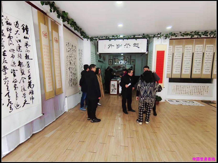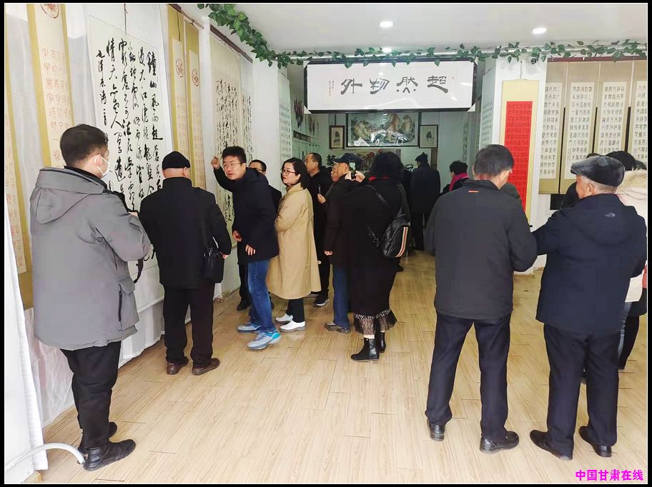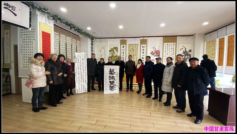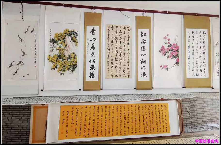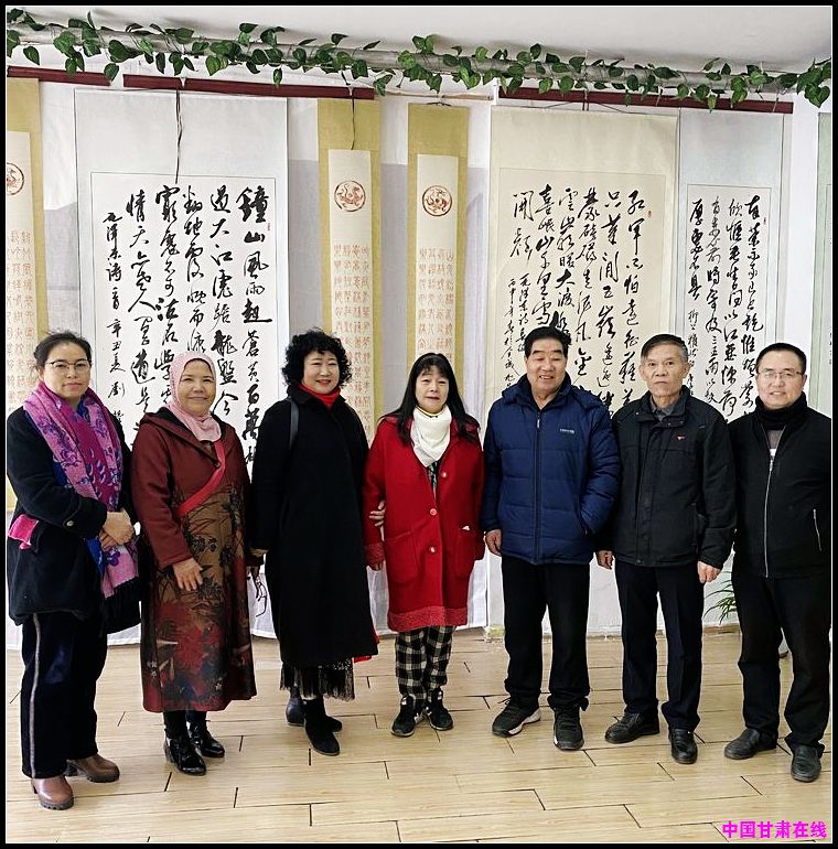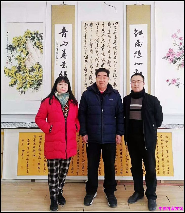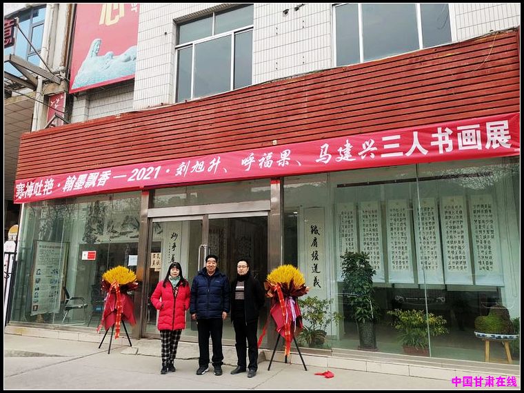 中国甘肃在线兰州讯(赵小春报道)寒梅吐艳,翰墨飘香。丹青敷彩,承兰亭之逸事,曲水流觞;挥毫泼墨,携杏坛之清风,砚池洗笔。巍巍白塔山,挥洒盛世和谐长卷;涛涛黄河水,依稀薛涛管卫笔韵。2021年12月11日。在兰州市七里河区画家村举行由甘肃省毛体书法艺术研究会刘旭升、呼福果、马建兴三位艺术家共同举办的书画展。此次共展出三位书画家55件精品力作,主要有行草、小篆和花鸟类艺术作品。
