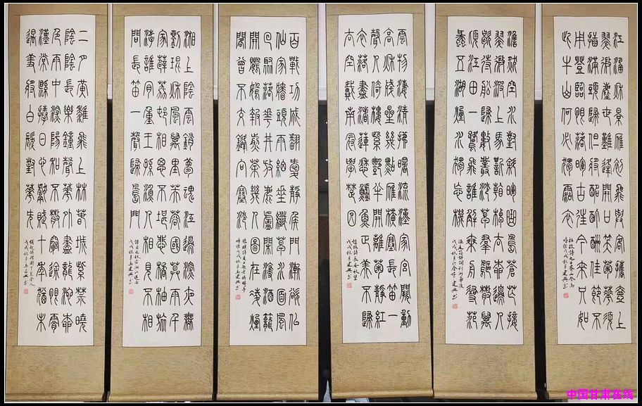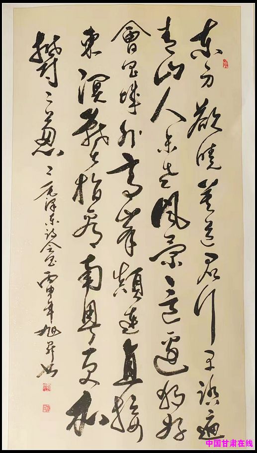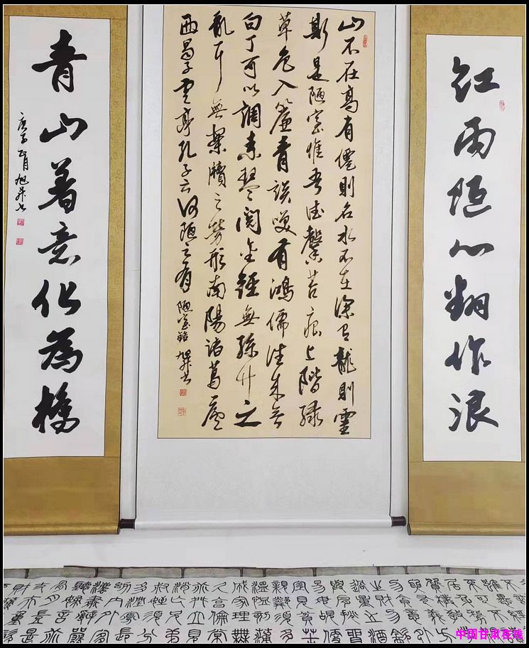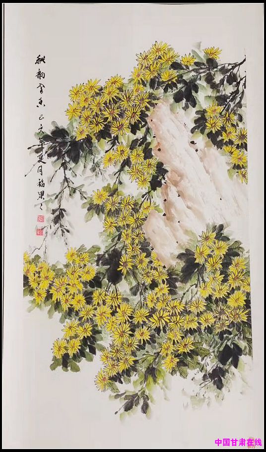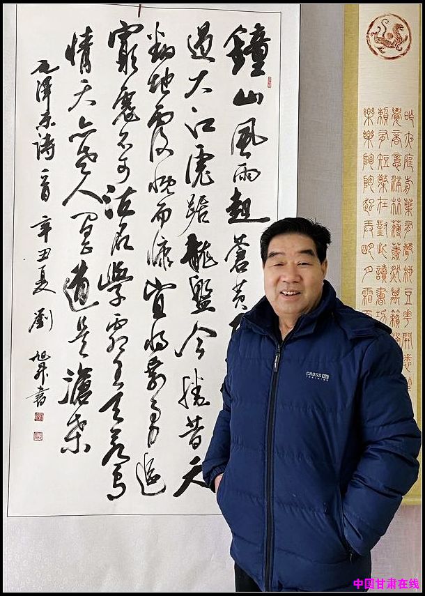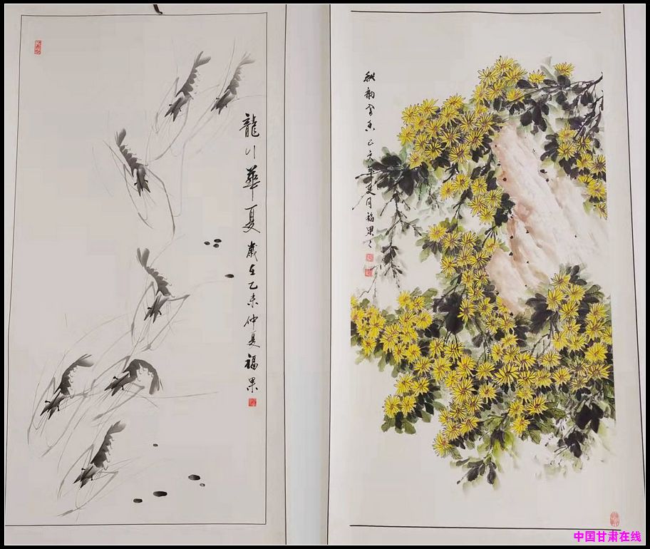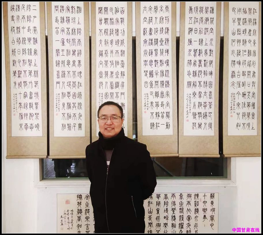 中国甘肃在线兰州讯(赵小春报道)寒梅吐艳,翰墨飘香。丹青敷彩,承兰亭之逸事,曲水流觞;挥毫泼墨,携杏坛之清风,砚池洗笔。巍巍白塔山,挥洒盛世和谐长卷;涛涛黄河水,依稀薛涛管卫笔韵。2021年12月11日。在兰州市七里河区画家村举行由甘肃省毛体书法艺术研究会刘旭升、呼福果、马建兴三位艺术家共同举办的书画展。此次共展出三位书画家55件精品力作,主要有行草、小篆和花鸟类艺术作品。