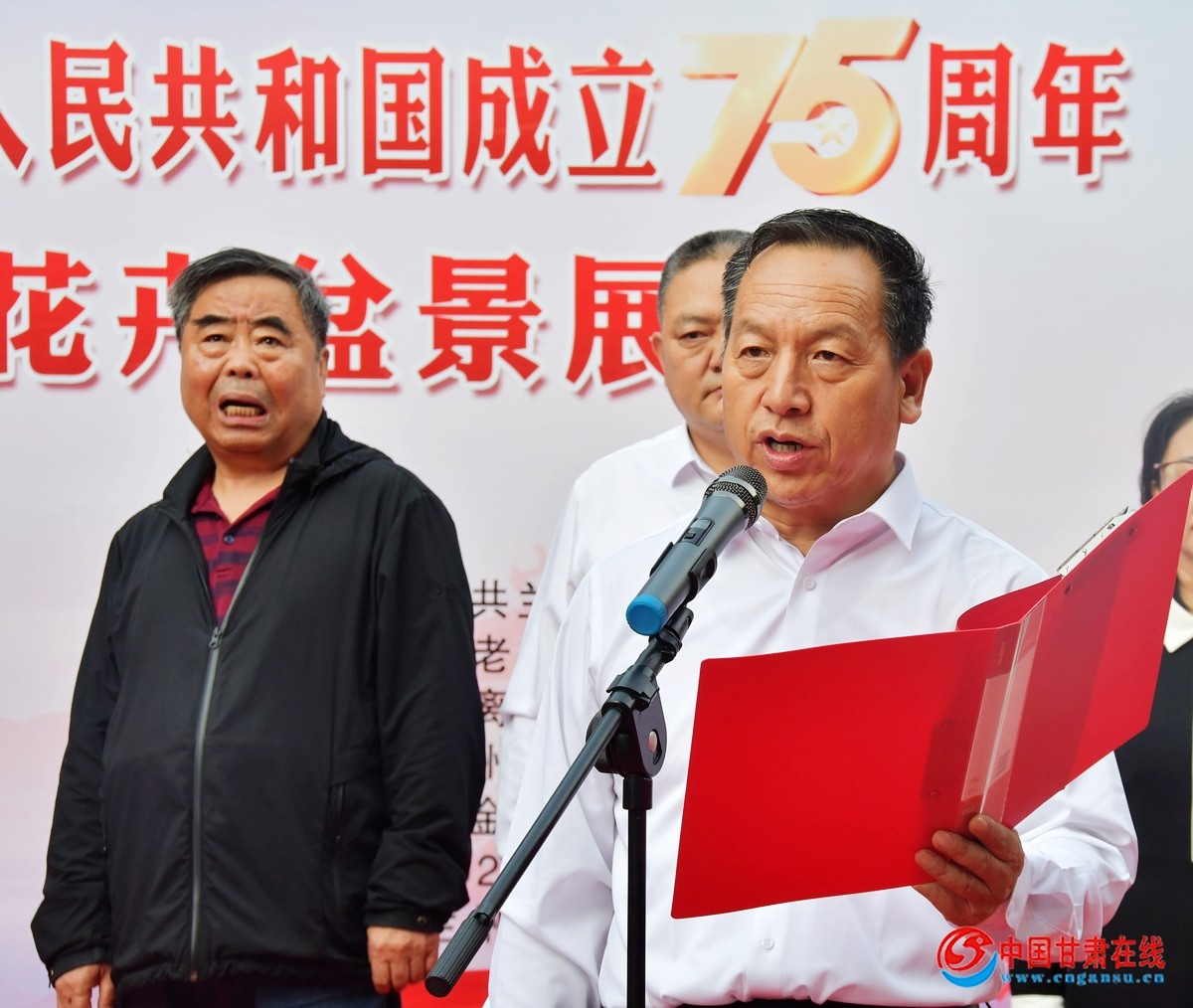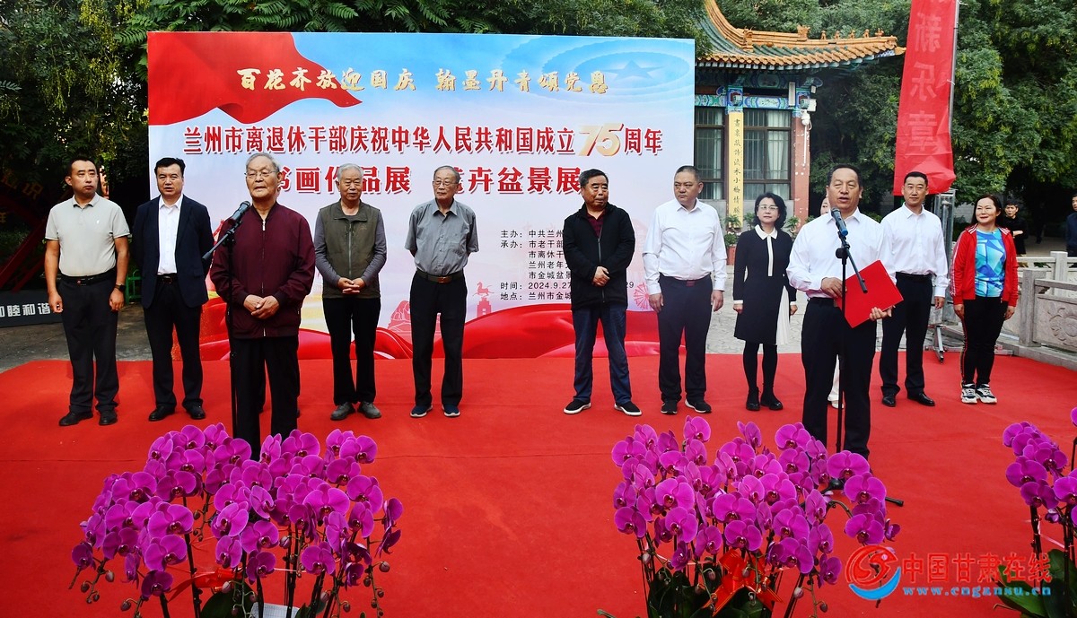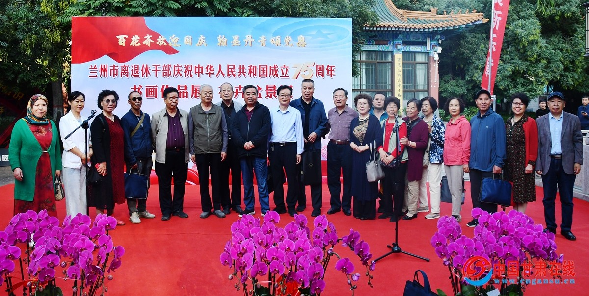 中国甘肃在线兰州讯 百花齐放迎国庆,翰墨丹青颂党恩。9月27日,金城盆景园内洋溢着喜庆热闹的气氛,兰州市离退休干部在此开展庆祝中华人民共和国成立75周年书画作品展和花卉盆景联展。