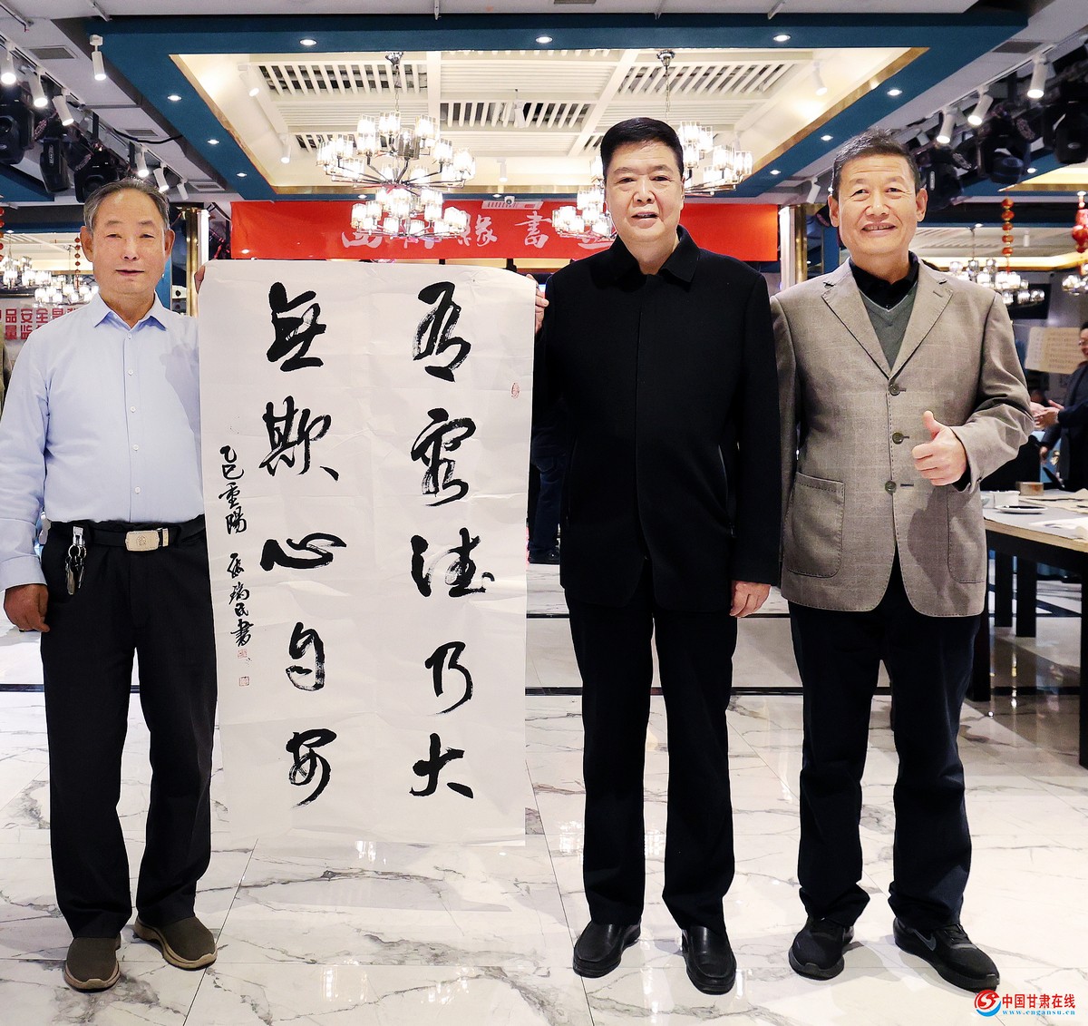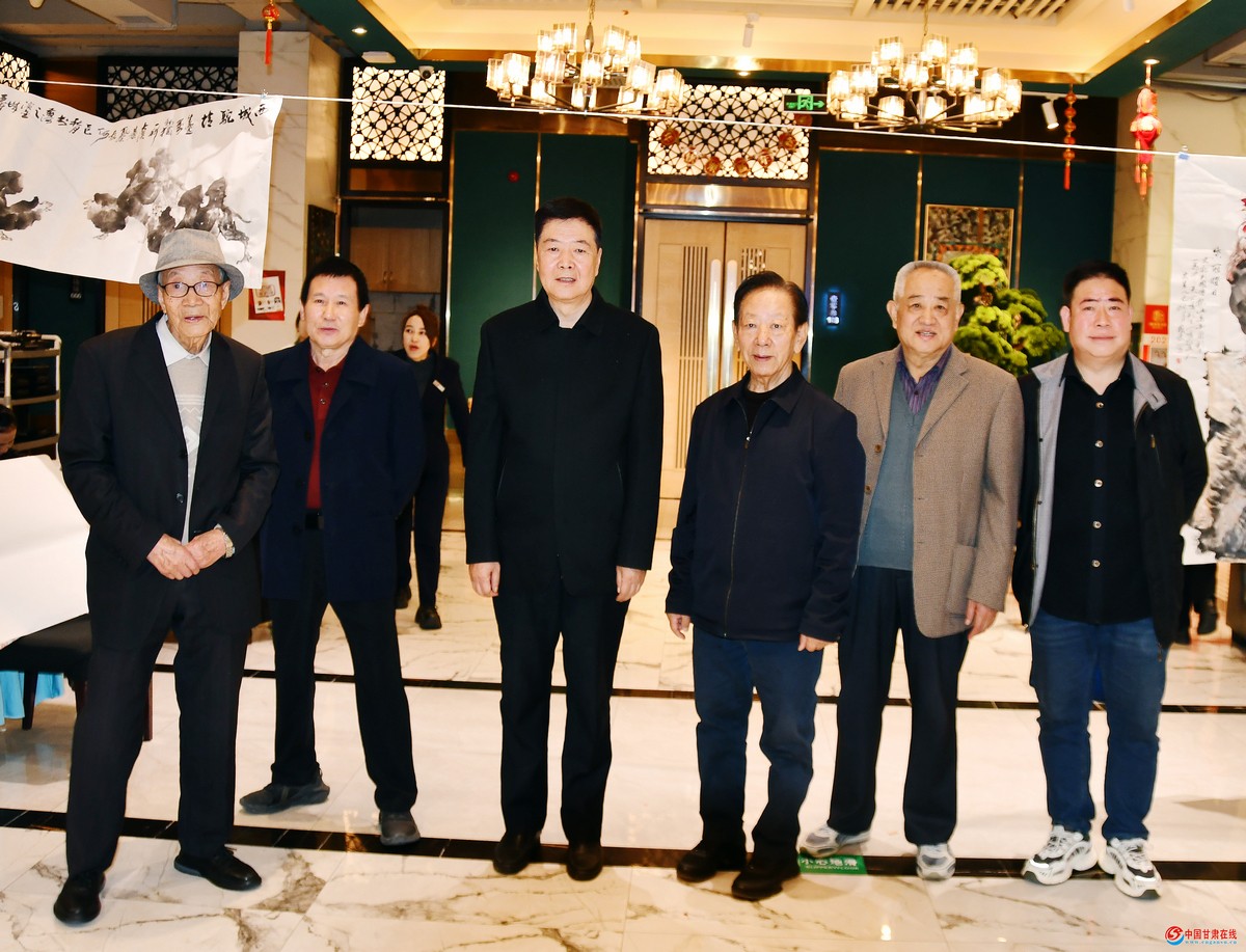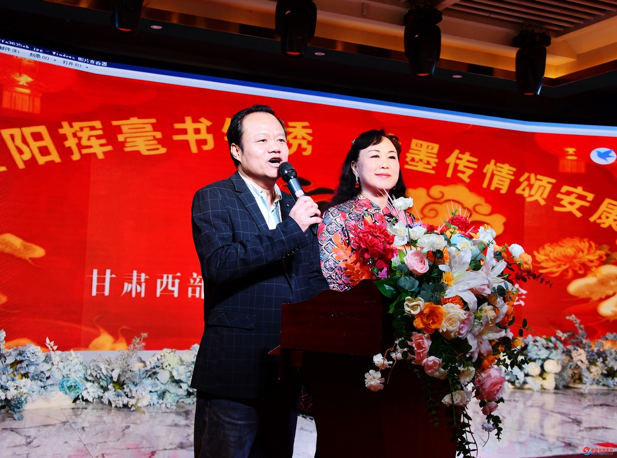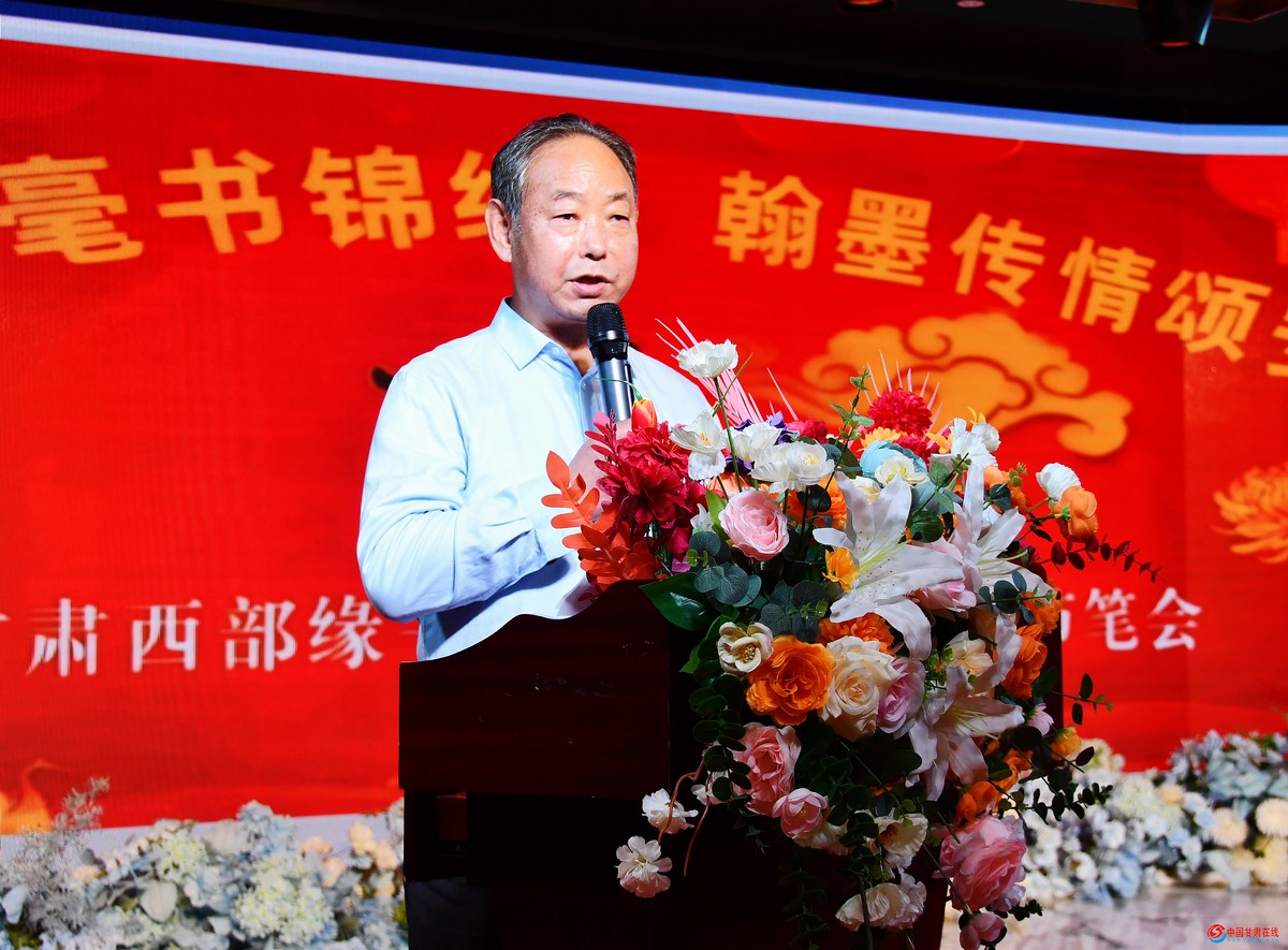 甘肃西部缘书画院辛万毅院长致辞。成立九年来,该院以书画为载体,不断创作和举办具有重要影响力的笔会活动近百余场,吸收有影响力的书画家加入进来,不断壮大发展队伍。通过走出去送书画进万家,以写春联、送文化到基层慰问等多种形式深入实施文化惠民举措,赢得社会各界赞许。尤其在书画创作中,书画院积极践行“书画精神食粮”为先思想。适时关注弱势群体和深入偏远地区为群众带去艺术享受和物质帮扶。