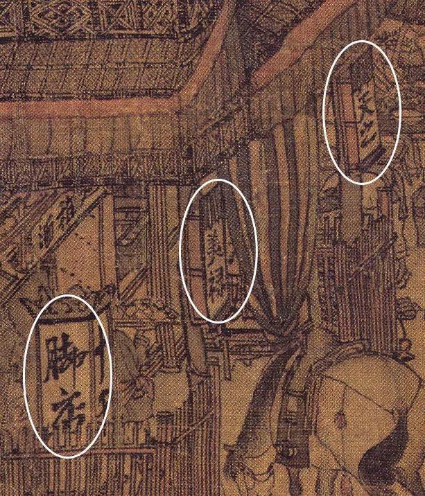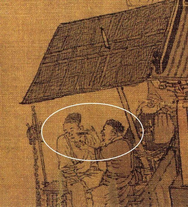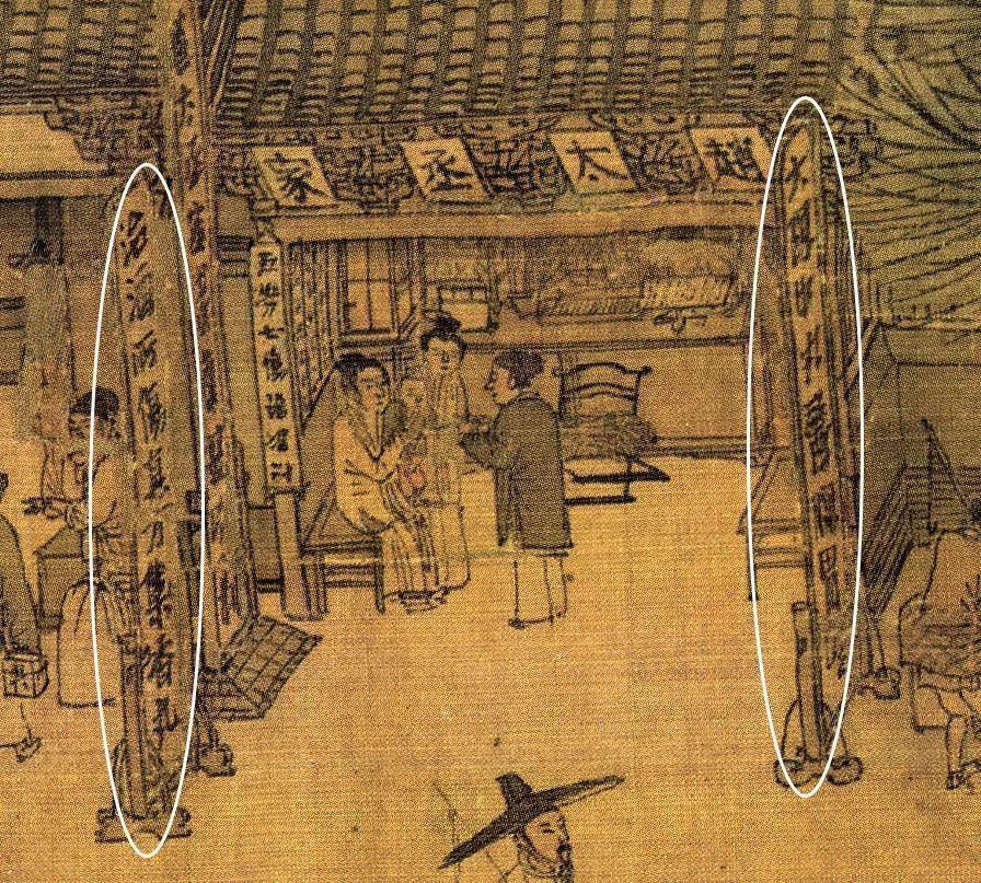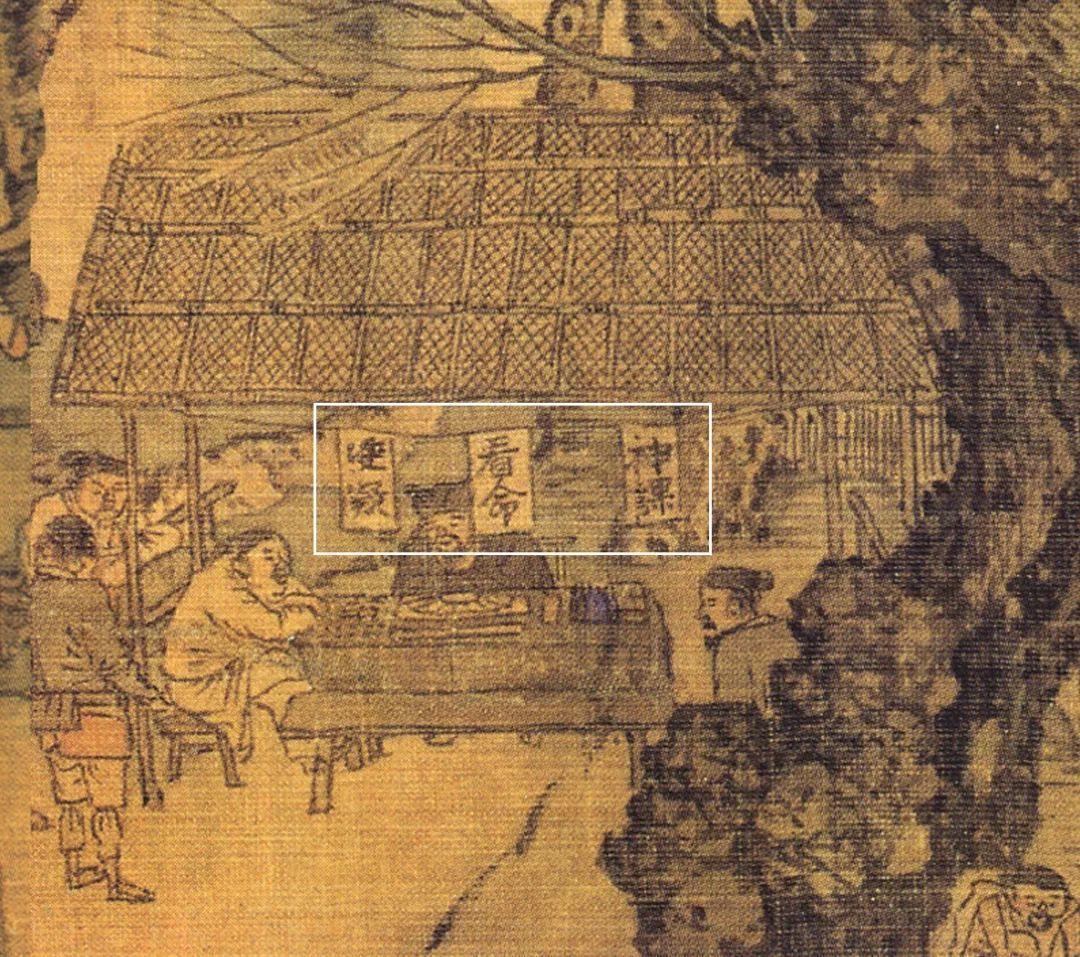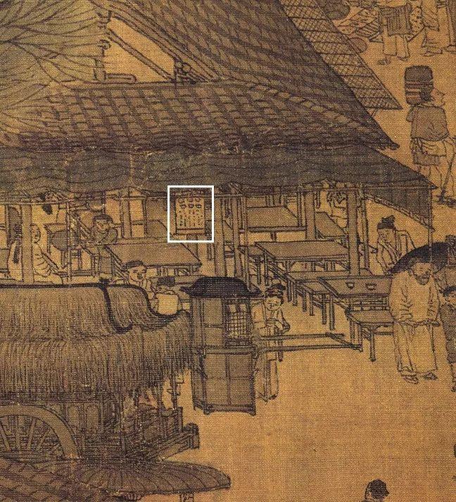 现在去一些比较小的饭馆里吃饭时,大家可能会注意到,菜单都是在墙上的,简单方便。下图中的茶肆中萃花圈出来的竖幅小帘子,据研究者称,它可能是世界上最早的菜单。