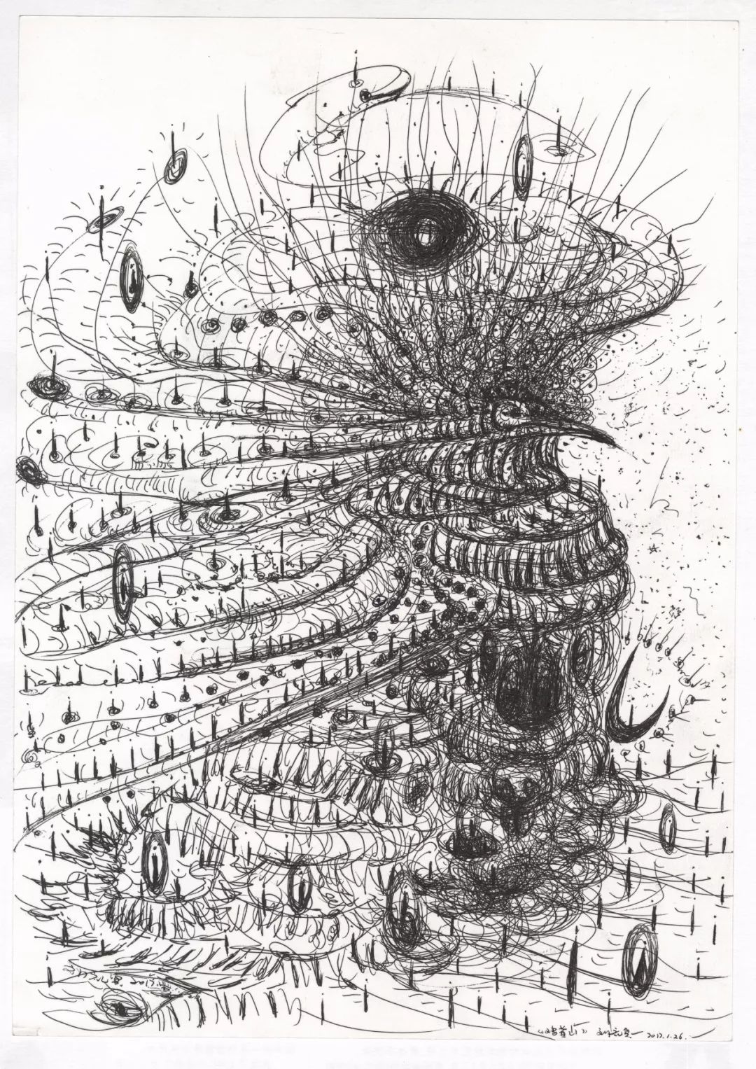 刘礼宾的艺术不同于纯粹的素人艺术又介于职业艺术之间,艺术创作的既定方法在刘礼宾的艺术的偶然里变得失效,艺术严肃的思考和审美评判标准在刘礼宾无意识状态下“乱勾”的中图示中被消解在笔笔相生之下,却依然完成艺术语言的叙述功能,这种叙述功能的实现不依托于抽象或者再现,也不是写实与写意。