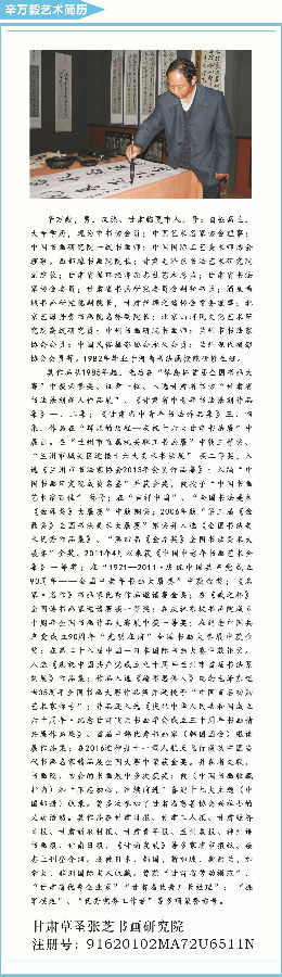 辛万毅先生生于1956年10月,出生于书香门第,家学渊源,他自幼酷爱书画艺术,从小受祖父及父辈的艺术熏陶,父辈们的书法功底在辛万毅幼小的心灵中留下了深刻的印象。他在书法的道路上,曾求教予甘肃著名书法家顾子惠、何聚川等书法老前辈。他楷书临习于颜真卿、郑道昭;行书学王羲之、米芾、黄庭坚;草书主学于孙过庭书谱、于右任标准草书等。已故陇上书法泰斗顾子惠,甘肃著名画家何聚川、黄汉卿等老一辈艺术非常看重辛万毅先生的作品,一致认为辛万毅先生的书法“功力厚重,富有神韵”。他在和这些书法老前辈的频繁交往、潜心学习中,受到了很大启发和激励,深得衣钵真传。