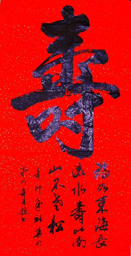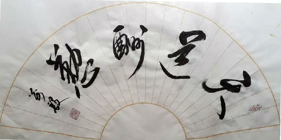 三看他的草书作品,诸如《龙》、《虎》、《马》、《寿》、《福》等榜书楷书以及条幅、长幅、扇面《沁园春.雪》、《清平乐.六盘山》、《上善若水》、《厚德载物》、《中国梦》等作品,如同欣赏一部优美的舞蹈,那一个个奇崛的墨字正像一个个翩翩的舞者,婉转自若,熠熠生辉,耀动着生命之光、活力之美、情感之韵,舒坦、美艳、惊叹、激越、亢奋,令人神思飞扬,无以释怀。他的草书堪称为“个性艺术”,有“挥洒纵横欲绝尘”之气势,有“万岁枯藤挂山崖”之壮美,有“万马奔腾千里风”之景象,究其源与流、文与质、艺与技,如“二王”之风流再现,如苏轼之个性彰显,如张旭之飞草张力。通篇观之、品之、赏之,辛万毅先生的草书作品,跌宕起伏,几近完美,近乎古之大家书风墨韵;局部微观,亦难有败笔、陋笔,那些生动的富有活力的线条,让人感到生命的鲜活与柔美,感悟到自然的壮美与丰饶,这是他将粗犷与柔美、古今与时空天衣无缝地融为一体,完美结合的艺术特质和书写风格。