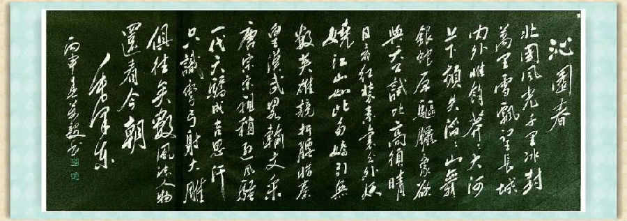 先看他的“毛体”作品,诸如《百花齐放 推陈出新》、《沁园春·雪》、《清平乐·六盘山》等作品,几近毛泽东之气势、之韵味、之风格,臂腕底生风,气势夺人,壮美、粗犷、俊逸,酣畅自如地冶铸着伟人的书风。书如其人,我更从他富有“雄浑”的书风中“读”到了一种志向、一种豪迈、一种气魄,“天高无盖,渊深无底”,在“毛体”书法的挥洒中,他率真、诚善、纯美,坦荡淋漓地书写着人品,书写着志向,也书写着豪迈。