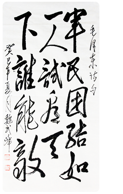 魏武峰,汉族,研究员,笔名龙门居士。陕西省陇县人,生于1944年9月。中国政法大学法律专业毕业。毛体书法家、中国书画院副院长、西部书画院副院长、甘肃毛泽东书法艺术研究院院长。