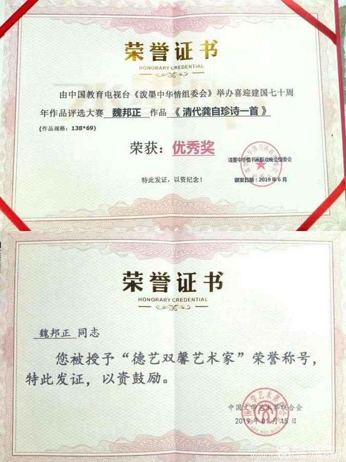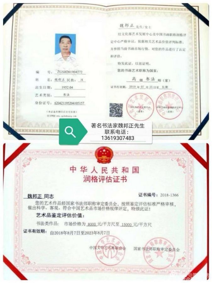 魏邦正现任中国书法家协会会员、中华人民共和国国家高级书法师,当品鉴魏邦正老师书法艺术作品时,不觉被其大气洒脱、古朴典雅、刚柔相济、游刃有余的书法艺术之美所陶醉!魏老师的大字书法艺术大气磅礴,结构布局恰如其分,体现了书法艺术“三美”也;小字行云流水、一气呵成、字与字之间相互呼应,尽显中国书法艺术之美!其作品深受藏家喜爱,具有较高的观赏价值和收藏价值!