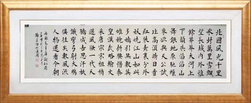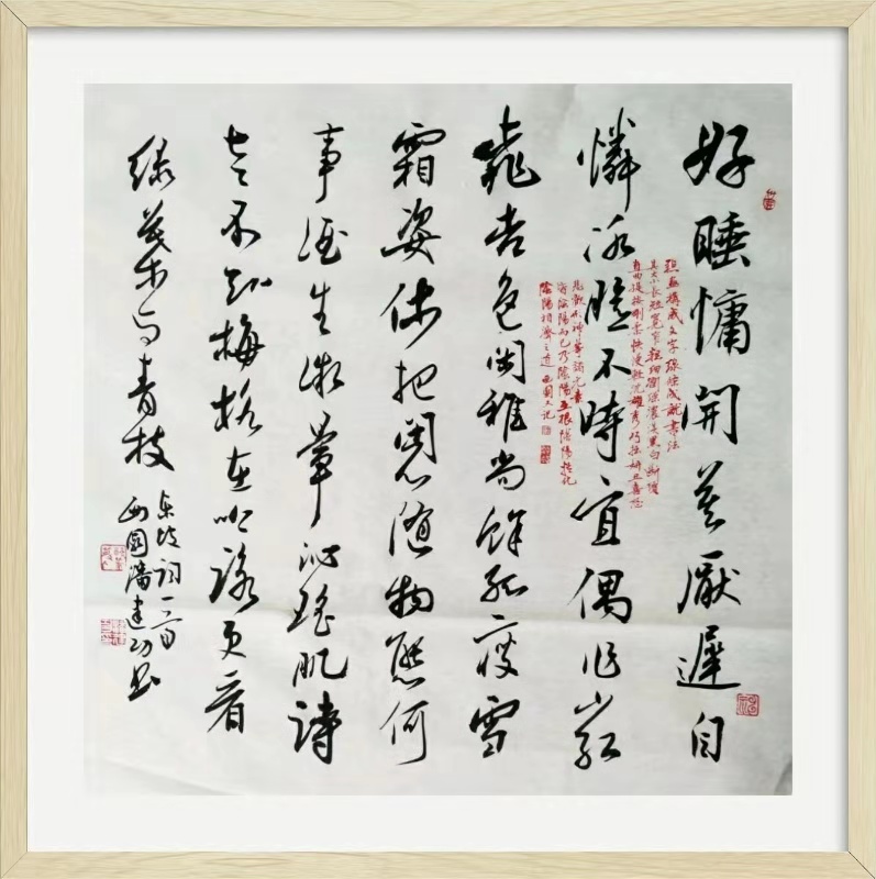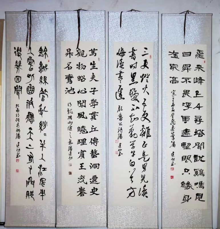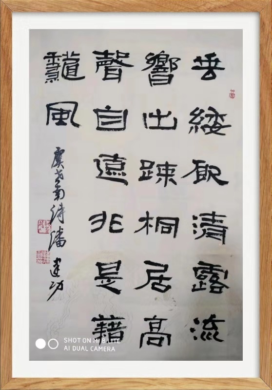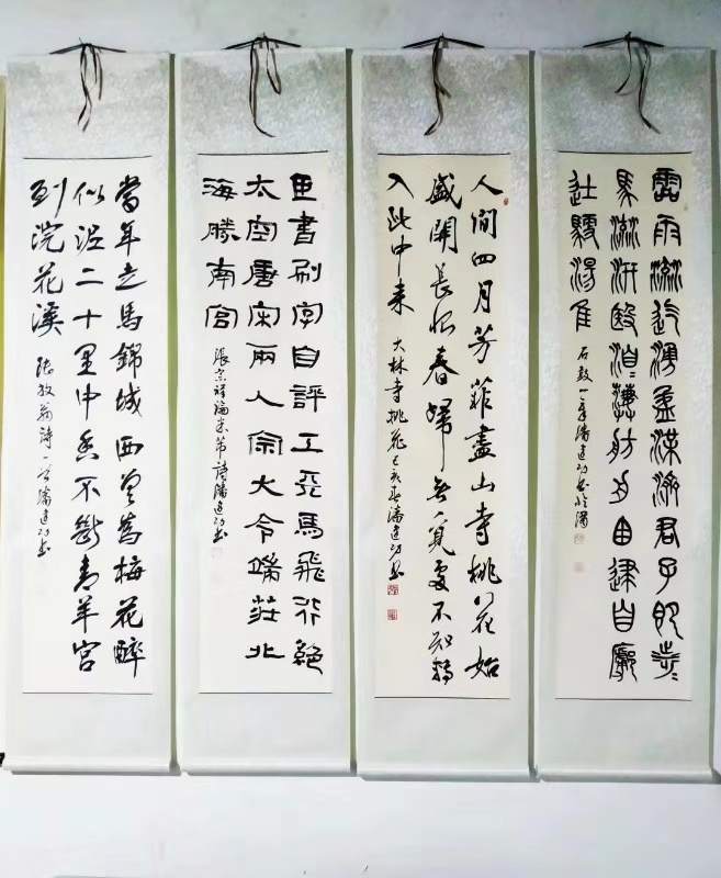 正是在书法上浸淫了四十年的经历,让潘建功在文学修养和笔法技巧上有着深厚的底蕴。西北师范大学书法文化研究院副院长、硕士生导师、书法学科带头人李逸峰这样评价潘建功:“墨香充盈校园内外,传统根植幼小心田。文化底蕴深厚,文史兼备,博学鸿词,涉猎广泛。”他评价潘建功的书法作品时说:“浸淫廿载,通临诸作,难怪其《娉花媚竹馆集宋人偶语》劲健稚拙,古雅天真,浑厚朴茂,金石味浓。习临吴俊卿《诗经小雅》纵横开阖,汪洋恣肆有大丈夫气概。阅其行书楷书,米芾风采斐然,蔡邕风格突显,刚柔相济,广搜博取。隐约间可见二王风姿,张玄韵味,不可谓其用志不坚,用功不勤也。”
