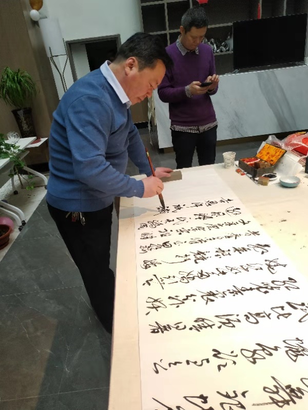 “我感谢通渭县这片文化热土,孕育了热爱书画艺术的人民群众,孕育了一代代书法创作人。”潘建功说。近年来,渐有成就的潘建功经常被通渭县相关部门和书协美协邀请去参加“送文化下乡”活动,到边远农村给村民们写楹联,写中堂。有一次,在华岭村“送文化下乡”时,一位年过七旬的老人始终站在潘建功的书案前,时而凝思不语,时而点头称赞,站着观摩潘建功挥毫四个多小时。后来,主办方说,老人虽然文化程度不高,但毕生爱字如命,遇到自己喜欢的书法作品就迈不动步。而这,只是通渭人喜欢书画的一个缩影。目前,通渭县10万余户几乎家家悬挂、收藏字画;全县从事书画习作创作的人员5000多人,年书画交易额超过10亿,被国家文化部、中国书画家协会等,命名为“中国书画艺术之乡”“中国书法之乡”等荣誉称号。