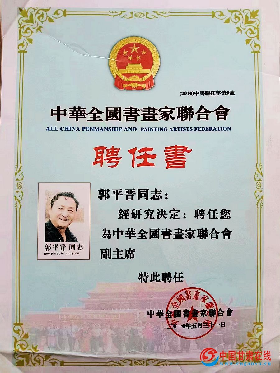 现为:中华全国书画家联合会副主席中国国家画院陈鹏工作室画家,中国国家画院师生联谊中心副秘书长,甘肃省文化艺术研究所副研究员,专职画家甘肃省美术家协会会员,作为伏羲女娲和敦煌艺术的故乡,甘肃以其神奇的自然地理风光、朴厚沉郁的爽直民风、悠久的历史文化底蕴,影响着郭平晋的艺术风格。