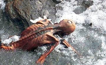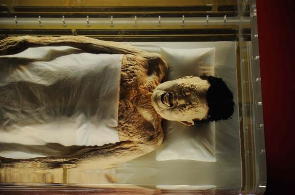 奥茨冰人(奥地利厄茨河谷,1991年)。这是一具世界上现有的最古老、保存最好的古尸之一。