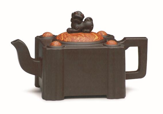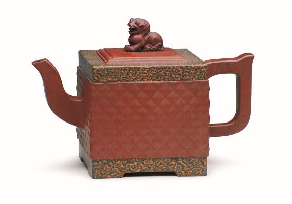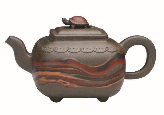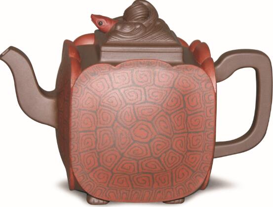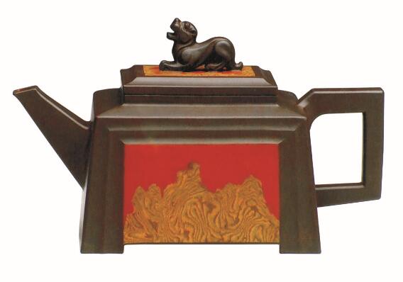 银箱壶"是作者借鉴红木银箱工整造型,巧妙构思而成,壶的四角用仿铜片镶嵌,红色护脚玲珑精巧,护角上的小柳钉几可乱真,壶体仿汉代油漆图案,绞泥纹饰自然神和,富有弹性感,壶嘴、壶把方圆得体呈现深紫红色,在雍容华贵的色彩中,呈现给人们的是风雅书卷的气息,文风扑面,雅俗共赏,大雅不群。