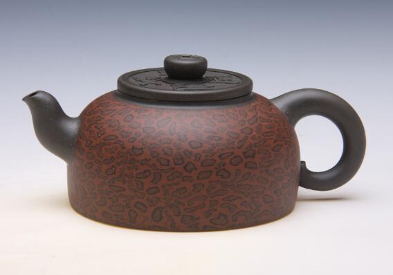 孔小明先生继承绞泥工艺,走着自己的艺术之路。他在绞泥中加以镶嵌等各种手法,演绎出方圆各异的艺术造型,捏塑出变幻多端绞泥水波花纹,作品整体美观大方,做工精细挺拔,线条流畅自然,每件作品都倾注着作者的智慧和心血。他配泥多变,调色大胆,作品所表现出的红黄相间的肌理花纹,受到李可染大师绘画的影响,浓墨重彩,惊艳而高雅,每次参展亮相,因漂亮的"容颜","娇艳"的身姿,总能抢尽风光。观壶会让人想起戴忘舒的雨巷:"撑着油纸伞,独自彷徨在悠长,悠长又寂寥的雨巷,我希望逢着一个丁香一样地结着愁怨的姑娘"这诗一样的江南,作家醉了;这江南一样的紫砂壶,观众也醉了。一把水色温润紫砂壶,因造型、气色、韵味和情调,承载着浓郁的江南文化,使人产生无限的遐想;蓝花布、油纸伞、茶香袅袅,琴韵悠悠......孔小明先生所寄托的情感也就不言而喻了。