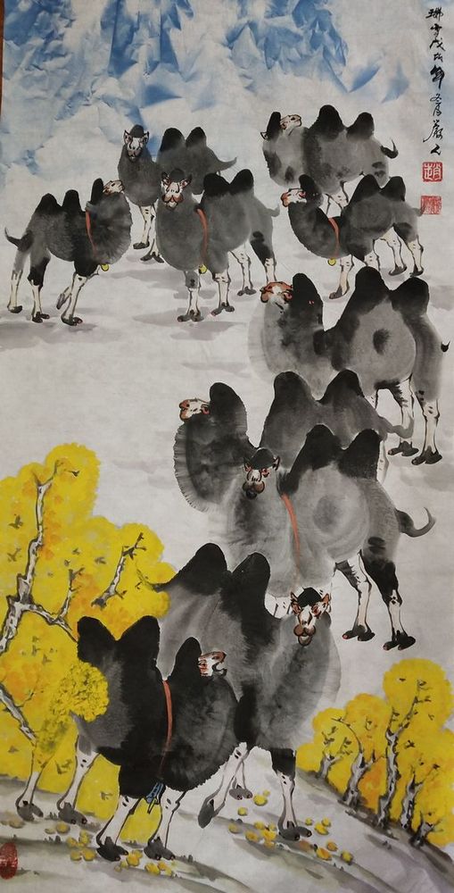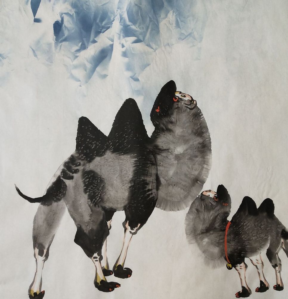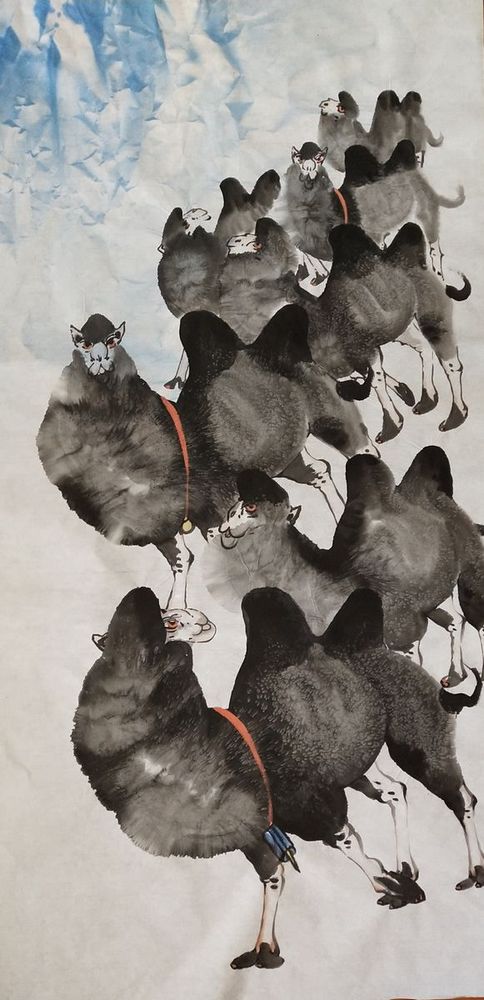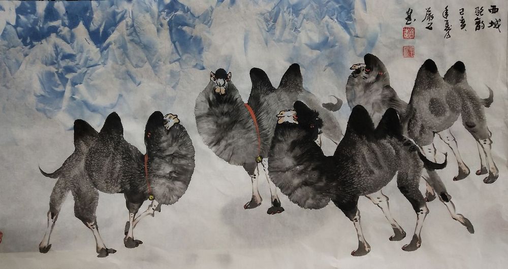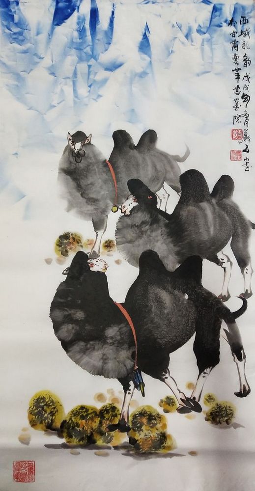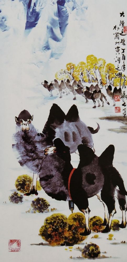 骆驼画“断崖万仞如削铁,鸟飞不渡苔石裂。嵯岈枯木无碧柯,六月不阴飘急雪。塞沙茫茫出关道,骆驼夜吼黄云老。征鸿一声起长空,风吹草低山月小。”作品深具西域特色之雄壮。塞沙、骆驼、黄云、征鸿、风、草、山月的景象,衬托苍凉、幽旷、寂静的书画意境。同展西部风情壮观,大气与深厚凄凉底蕴。