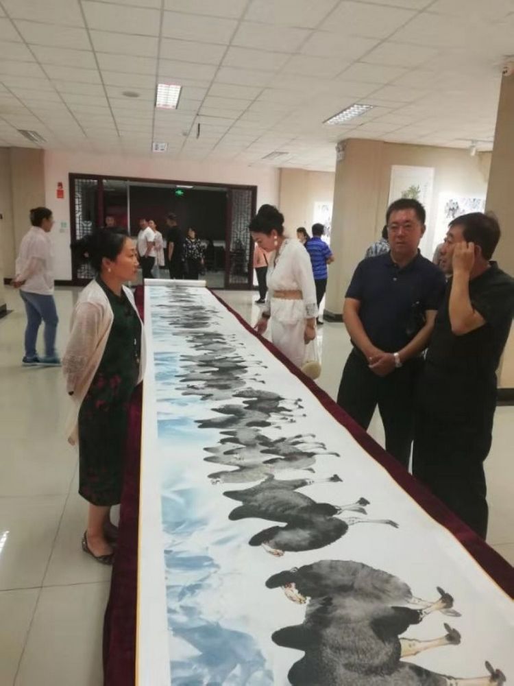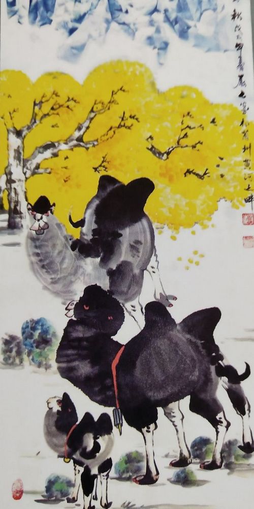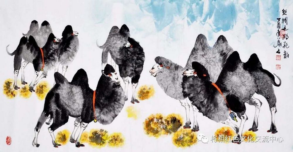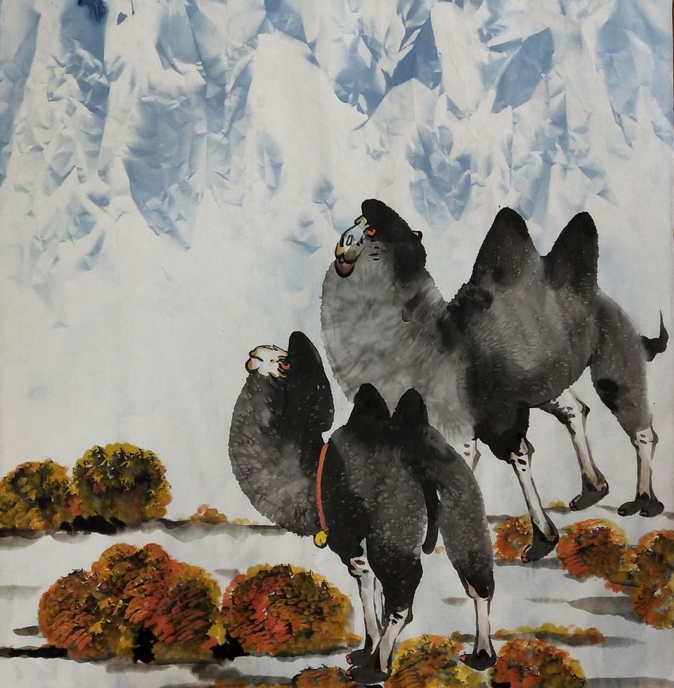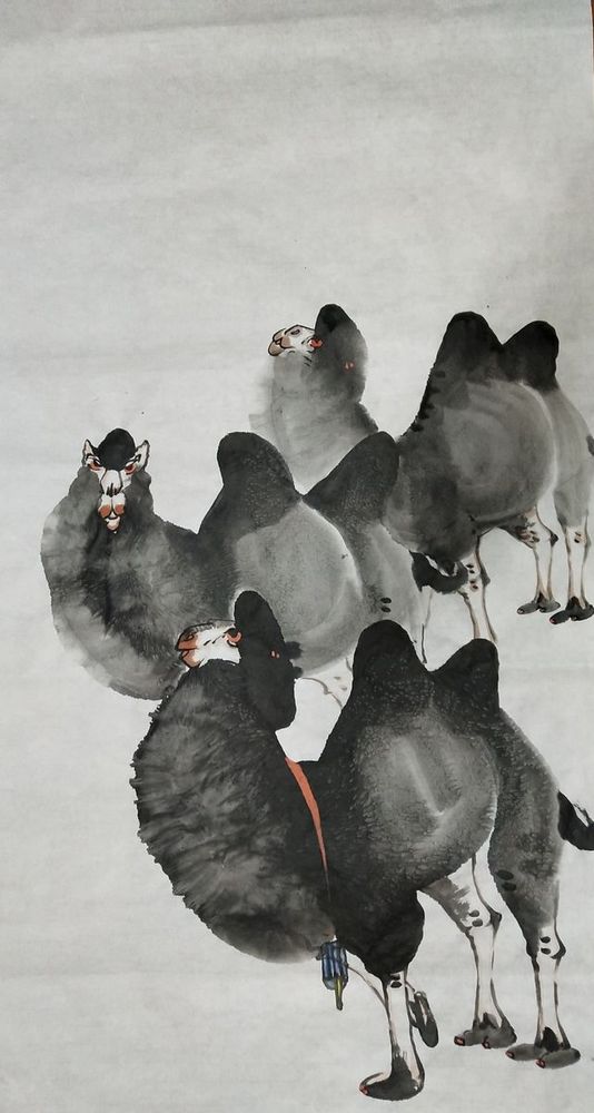 骆驼画“断崖万仞如削铁,鸟飞不渡苔石裂。嵯岈枯木无碧柯,六月不阴飘急雪。塞沙茫茫出关道,骆驼夜吼黄云老。征鸿一声起长空,风吹草低山月小。”作品深具西域特色之雄壮。塞沙、骆驼、黄云、征鸿、风、草、山月的景象,衬托苍凉、幽旷、寂静的书画意境。同展西部风情壮观,大气与深厚凄凉底蕴。