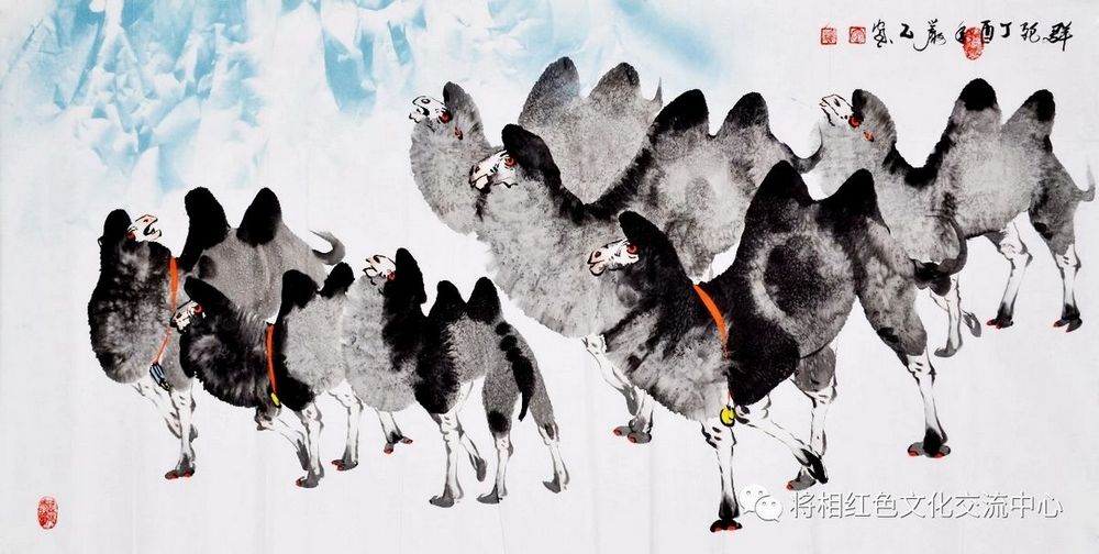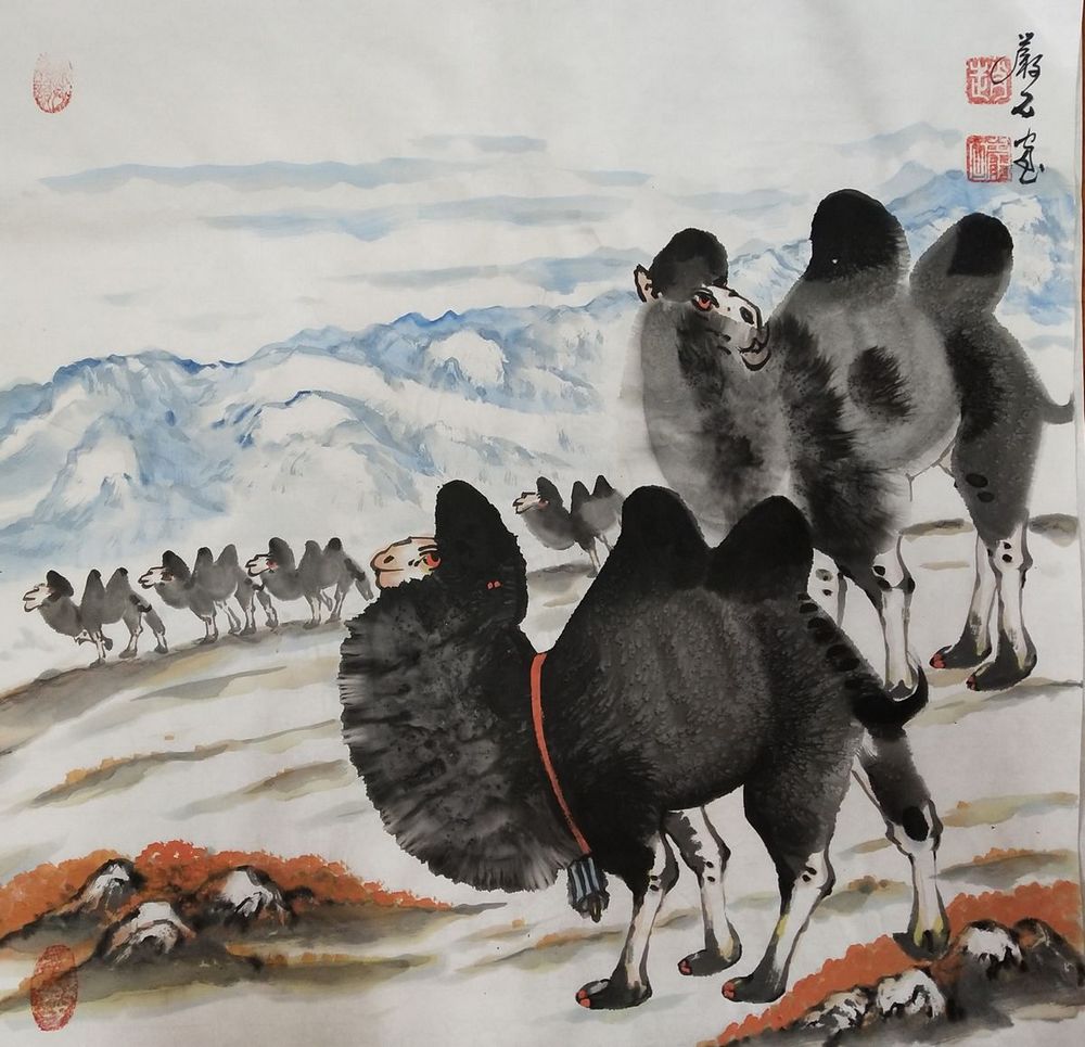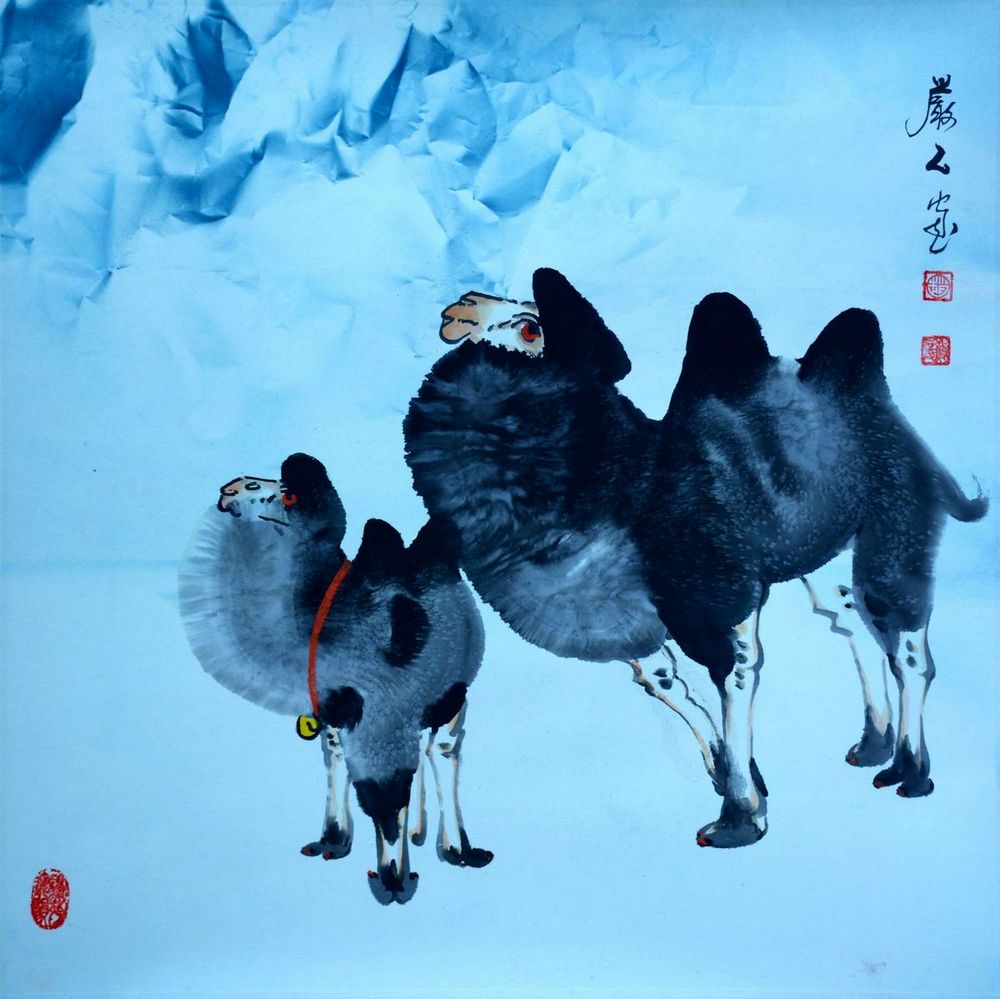 尤其笔下冰雪骆驼,融冲墨法点缀驼毛质感,令画作淋漓尽致、栩栩如生;借皱纸法将冰域雪原刻画美轮美奂;以点墨法将大漠古城金沙渲染雄伟壮观。引胜沙漠风情再现,梦回秦关。其作广为海内外藏家收藏。