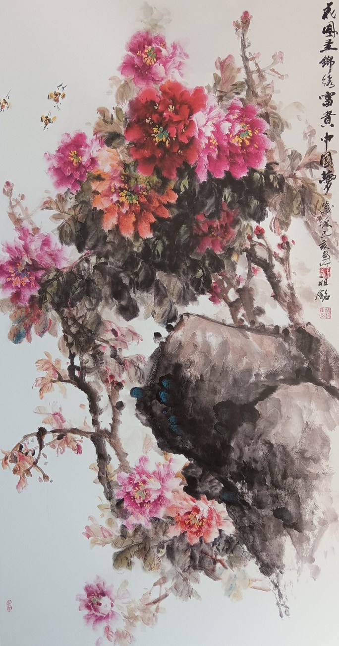 当人类社会定义造型艺术为美术,它实际上就已然毫无疑义地具有了“真、善、美”的精神指向和艺术旨归。特别指出的是,当中国进入了新的历史发展时期,当中国人民期望已久的理想就在眼前的时候,人们渴望于美术的境界赋予新的内涵的真、善、美。1978年十一届三中全会的召开,决议把党的工作重心转移到以经济建设为中心的工作中来的时候,当时的人们在思想和精神得到了前所未有的振奋和鼓舞,正是在这样特定的时代背景下,王祖铭先生决意拿起手中的画笔,选取以牡丹花卉为表现主体,借以表达世人昂扬的精神风貌和奋进勃发的时代精神。在精研传统的基础上,王祖铭先生深入生活、扎根人民,历经艰辛探索和霜晨雨夜的努力,最终在牡丹花卉这一传统花鸟画题材上取得了突出的艺术成就,其成功的要义主要体现在:他对牡丹花卉的整体造型和叶片结构以及牡丹颜色层次的精准把握,其中,色彩的变化、层次的丰厚尤为凸显,除此之外,他还特别注重牡丹花卉枝干、叶子的浓淡变化,以藤黄去精心点缀花蕊,脱却了他人的那种浮躁、草率、肤浅的流俗气息;更为重要的一点就是,王祖铭先生在牡丹花卉施墨过程中对于水份的掌握和驾驭恰如其分,使得其笔下的牡丹花卉具有着一种极强的生命力,笔墨酣畅,水气十足,那种水淋淋的艺术质感,仿佛流透出一种生命的光泽!王祖铭先生以较为细腻的笔法,注重线条的变化轨迹,佐以西方绘画的光影、透视技法,以其精湛的笔墨技艺,将自己真切的情感注入到牡丹花卉的倾情演绎中,创作出了《云开花弄影》、《壮观人间春世界》、《国色天香露华浓》、《紫气东来》、《富贵长青》、《福蕴神州》等一大批经典的美术作品,在王祖铭先生的艺术感召下,西北地区的美术事业得到了前所未有的蓬勃大发展,而他的这种独特的艺术表现手法不仅丰富了当代中国花鸟画图式的艺术表达,更使得中国传统花鸟画艺术发展路径得到进一步的开拓和延展,在我看来,这是极其难能可贵的!诚然,中国绘画之精要在于笔墨之美,中国绘画之道在于笔墨,笔墨之于中国绘画,一为造型,一为性情。天地万物形态各异,亦各有奇趣,画家须用笔墨写其形、取其神,以媲造化天成之功,而笔墨内涵美质,轻重缓急、提按皴擦、浓淡干湿又无不契合着画家的性情禀赋,故可寄情于笔墨,问道于己心,笔墨相会之时,或圆润流畅、清澈明秀;或凝重古朴、力若钟鼎;或浑厚老辣、雄强遒劲,其间所表达出的有体有用,有胎有骨,有形有势,有开有合,天机自张,乃是性灵所钟,性情所致也!