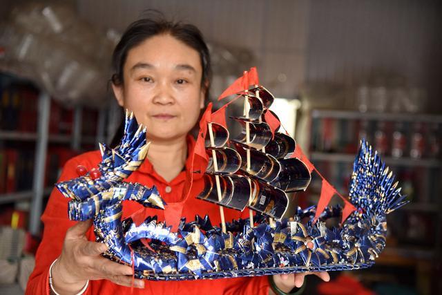 一件废旧烟盒折纸作品需要消耗很长的时间。魏建娥指着柜台上的龙船说,需要先对100多个整条装的大烟盒剪裁,再折叠、拼装,差不多需要十几天的时间。