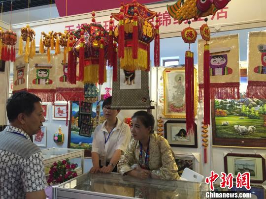 图为甘肃藏族刺绣产品吸引客商驻足观看。徐雪 摄