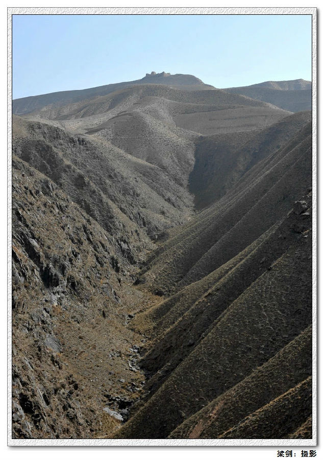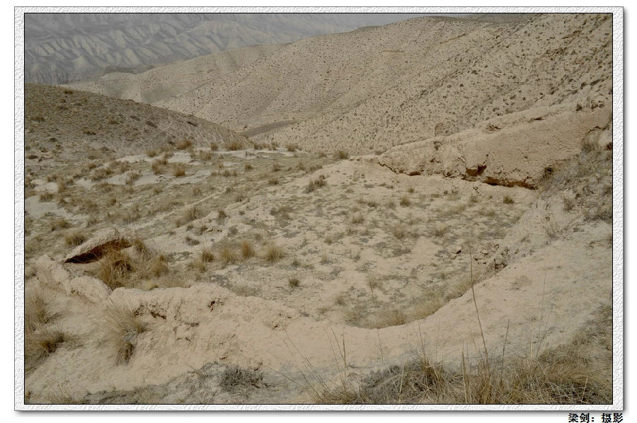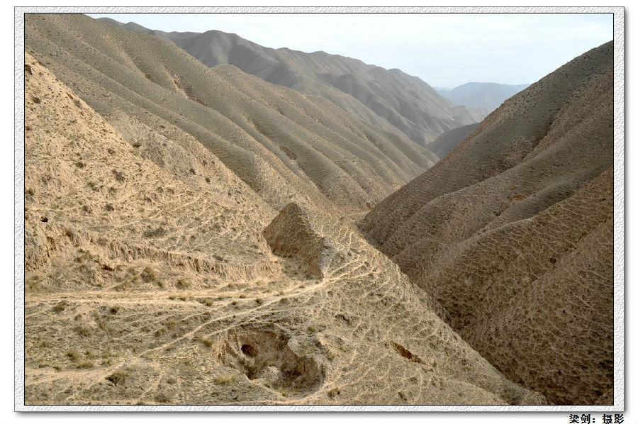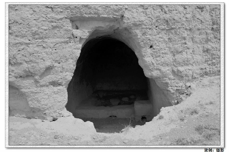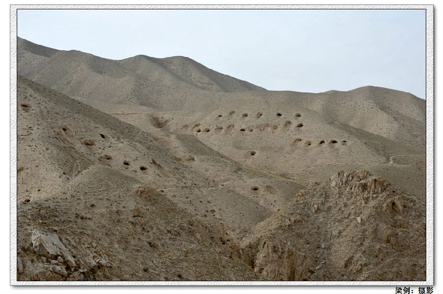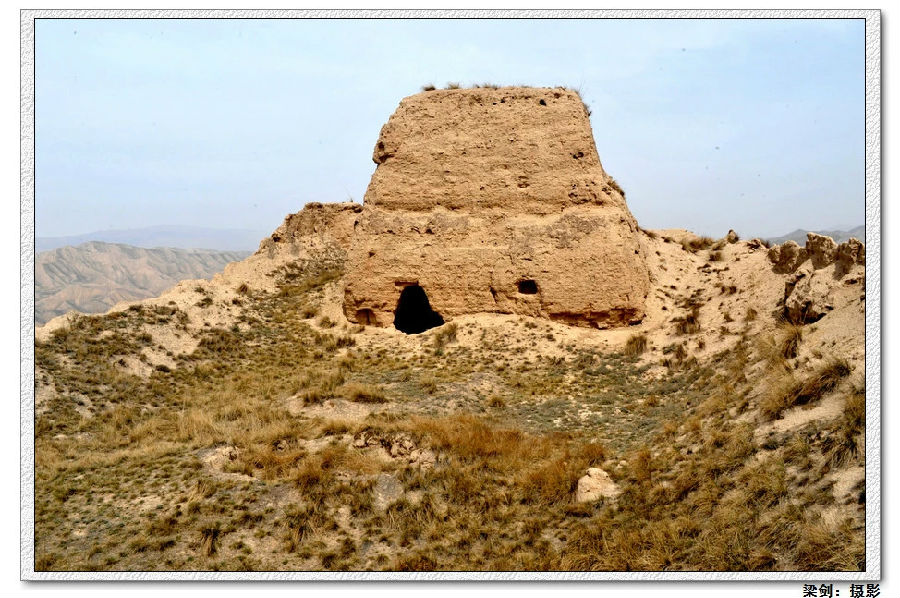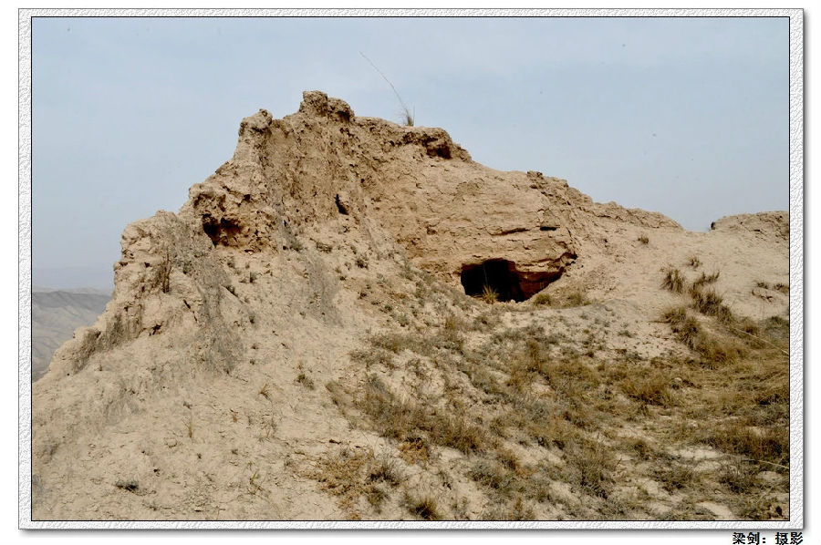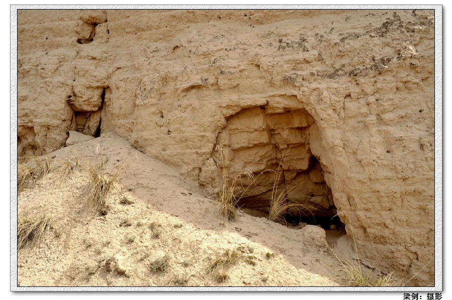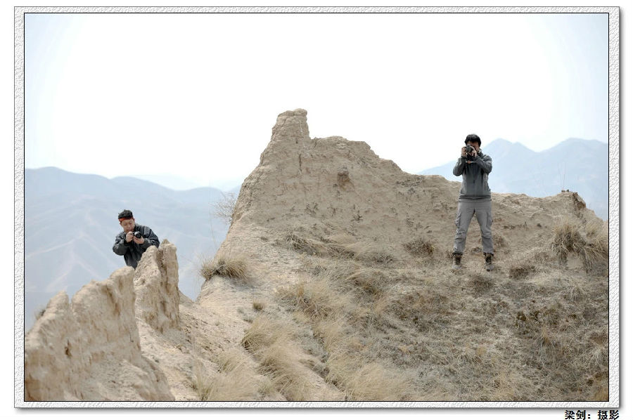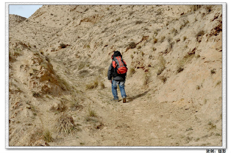 我们找路准备攀登糜不老墩,糜不老墩是就近烽火台最高的,山大沟深我们无法将自己的背囊背上山,就寻找山洞将三个大包放在山洞内,带上吃的、水和照相机,经过3个半小时上下,拍摄纪录了糜不老墩烽火台的结果。(摄影:梁剑)