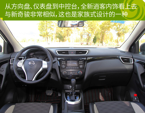 从方向盘、仪表盘到中控台,全新逍客内饰看上去和用起来都与新奇骏非常相似,这也是家族式设计的一种。内饰的质感相比上一代车型有很大进步,用到了很多软性材质,这是中国消费者很喜欢的。当然,深色内饰有一个问题就是,光亮的中控台面板有点儿灰尘就很容易显脏。