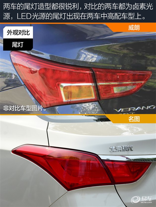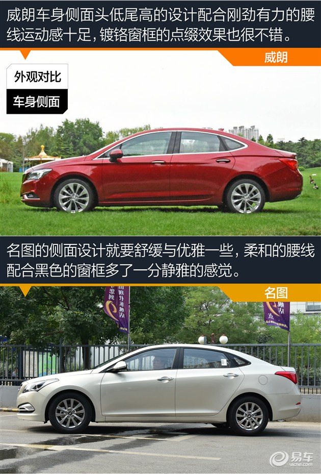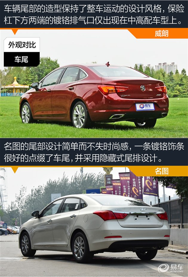 外观小结:威朗头低尾高的造型看上去更运动,而名图则相对大气典雅一些。配置上名图比威朗更丰富一些,多了全景天窗、自动头灯等配置。