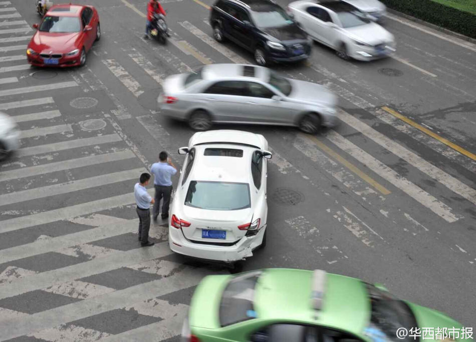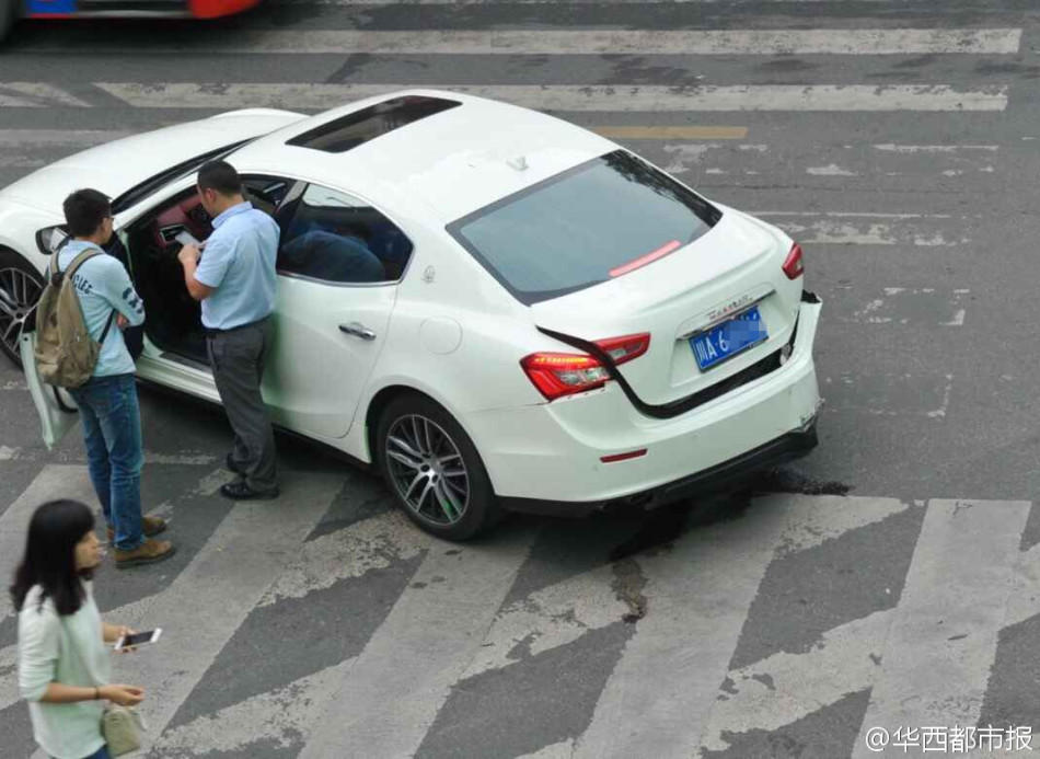 [摘要]据网友爆料,下午4点过,成都上东大街段和青石桥北街十字路口,一辆玛莎拉蒂和一辆奥迪A7发生车祸。5点,记者赶到现场看到,玛莎拉蒂车尾已经被撞变形,奥迪已被拖走,保险公司工作人员正在现场查勘。