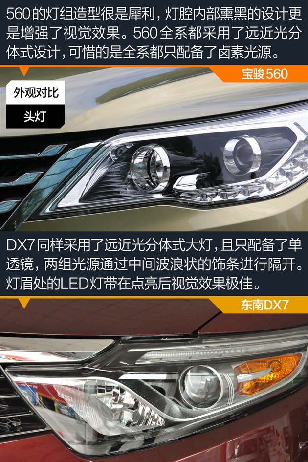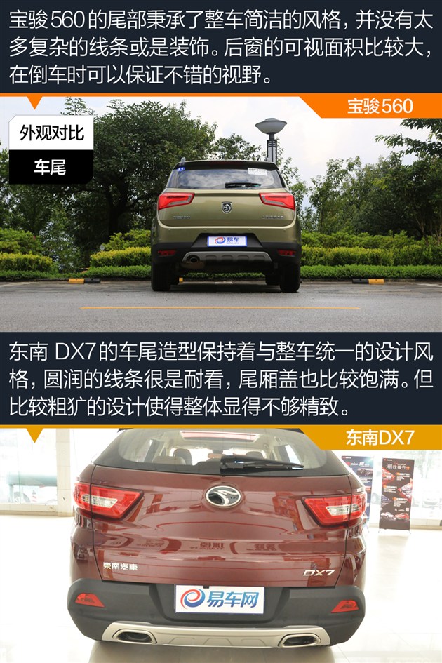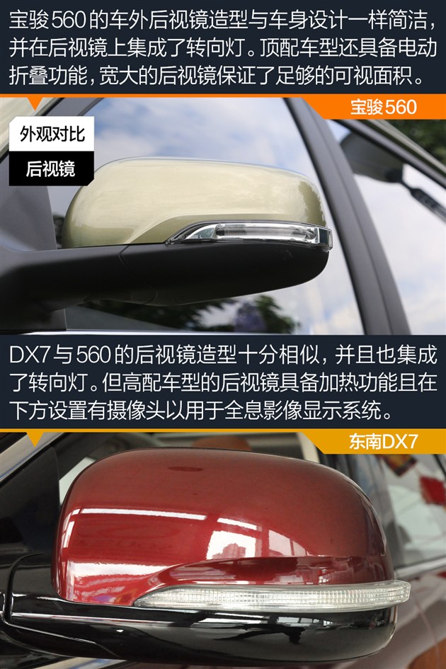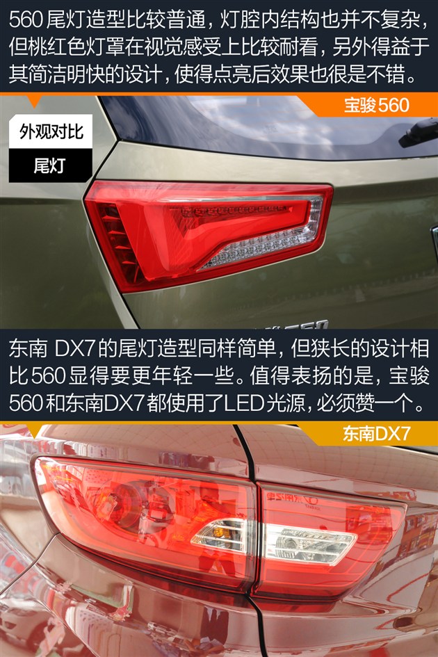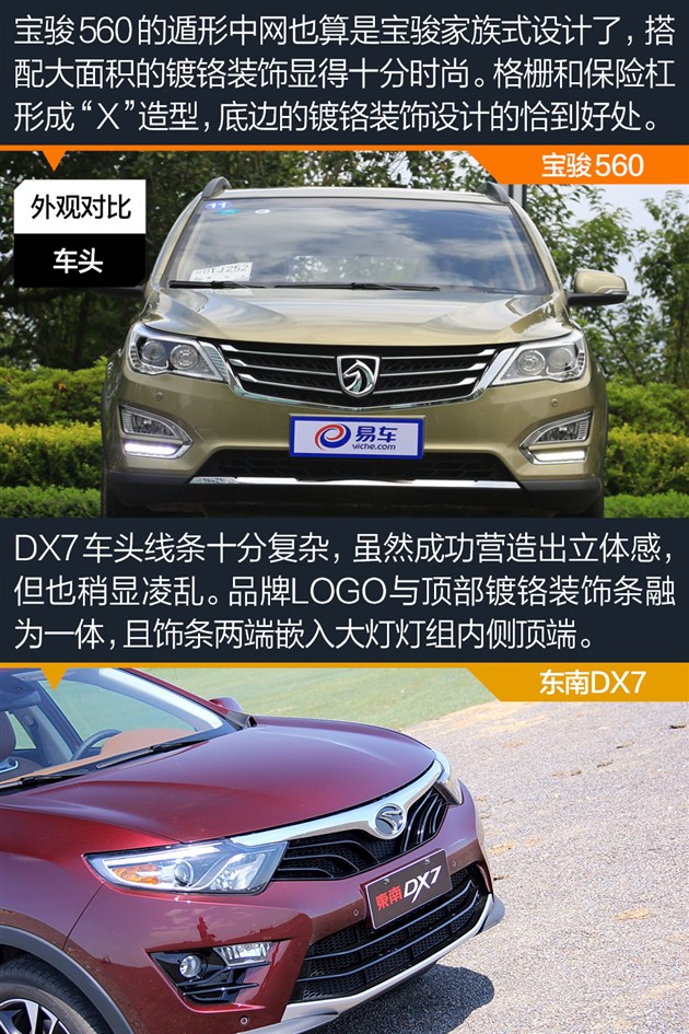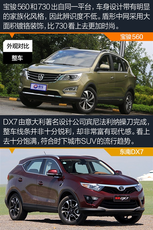 外观小结:宝骏560虽然脱胎于730,整体带有浓郁的家族风格,但相比730更为时尚也更加耐看。DX7作为由宾尼法利纳操刀设计的车型,线条十分饱满,立体感很强,也更符合时下的设计潮流。