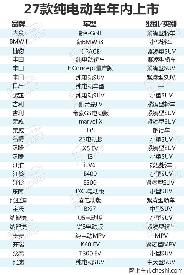 2017年国内新能源汽车市场增长迅猛,全年销量突破70万辆大关,同比增速超50%。其中纯电动乘用车销量超40万辆,成为新能源汽车的销售主力。数据中不难看出,人们的汽车消费理念正在逐步转变,绿色环保、后期使用成本低等优势,让纯电动汽车越来越“吃香”。网上车市梳理各大车企2018年新车规划后发现,将会有27款纯电动车型上市,其中超半数为SUV车型。