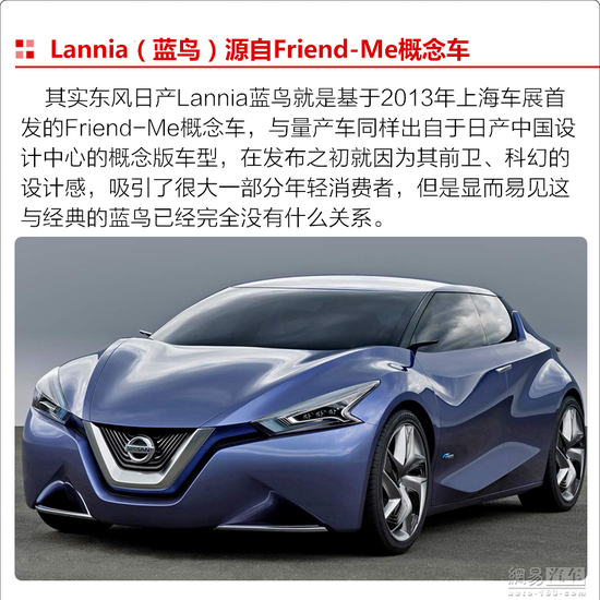 其实东风日产Lannia蓝鸟就是基于2013年上海车展首发的Friend-Me概念车,与量产车同样出自于日产中国设计中心的概念版车型,在发布之初就因为其前卫、科幻的设计感,吸引了很大一部分年轻消费者,但是显而易见这与经典的蓝鸟已经完全没有什么关系。
