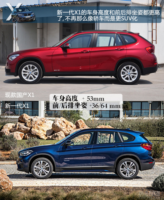 在车身尺寸方面,新一代宝马X1高度相比于老款车型增加了53mm,而增加的车身高度被悉数用在了提升内部空间上,最显著的感觉就是驾驶姿态的变化。相比 于老款车型,新一代宝马X1的前排座椅坐姿提高了36mm,后排坐姿提高了64mm,由此形成了前低后高的剧院式座椅布局