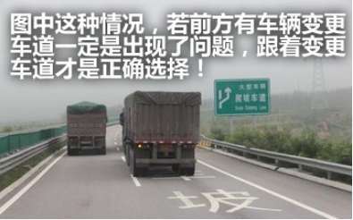 行驶在高速路或快速路上时,前车突然打转向灯,变换车道。碰到这种情况,不要高兴太早,以为前车给你让道。更多情况是,前车看到你所没有看到的状况。有可能是前方路中间有障碍物,或前方发生事故,需要紧急避让。所以,最佳处理方法是跟着前车打转向灯,变换车道,而非加速超过前车。