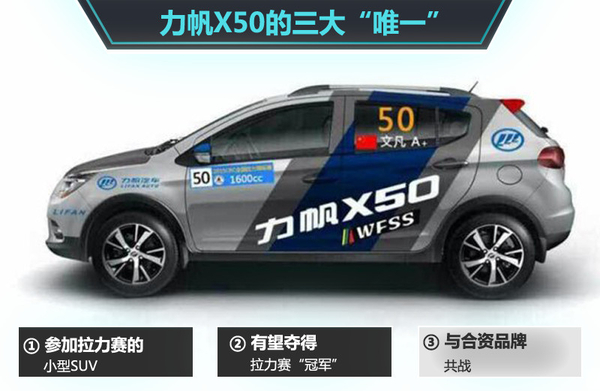 力帆X50于2014年11月上市后,在全国消费者中树立了不错的口碑,特别是在车辆的“操控性”方面。不过只有激烈的赛场和拉力路面才能更好的展现这个特点,所以力帆X50在小型SUV市场中有不可多得的三大“唯一”特性:同级车中唯一一款参加拉力赛的小型SUV、同级车中第一款有望夺得拉力赛“冠军”的小型SUV、同级车中唯一一款与合资品牌共战的小型SUV。 (力帆X50车队将与POLO车队、斯柯达车队通场竞技)
